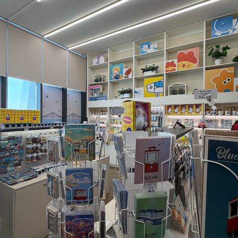 역에는 귀여운 기념품 가게와 부산 및 청색선 액자를 제공하는 포토 부스도 있어요.