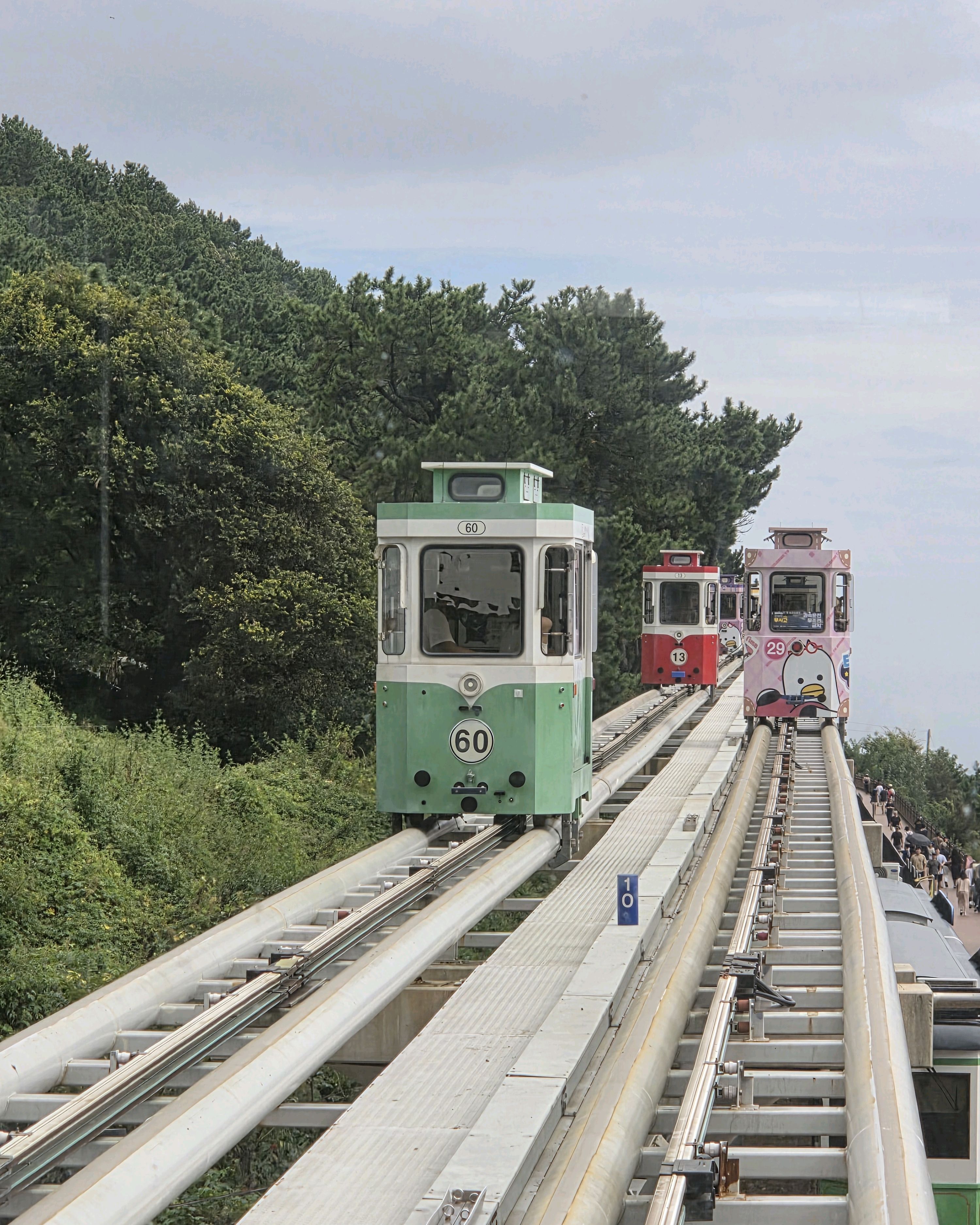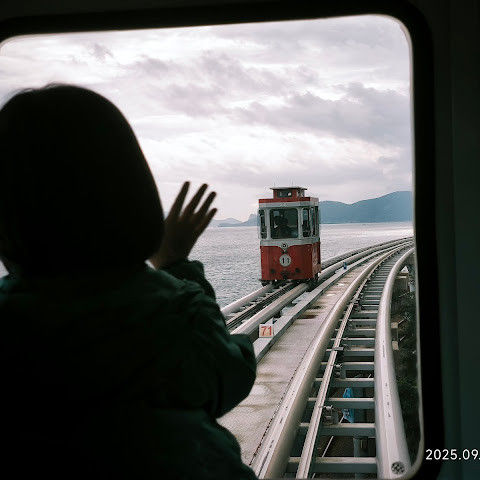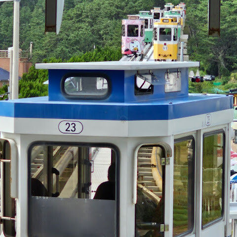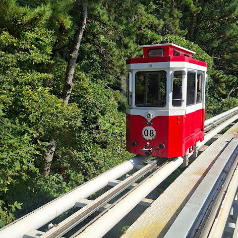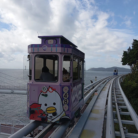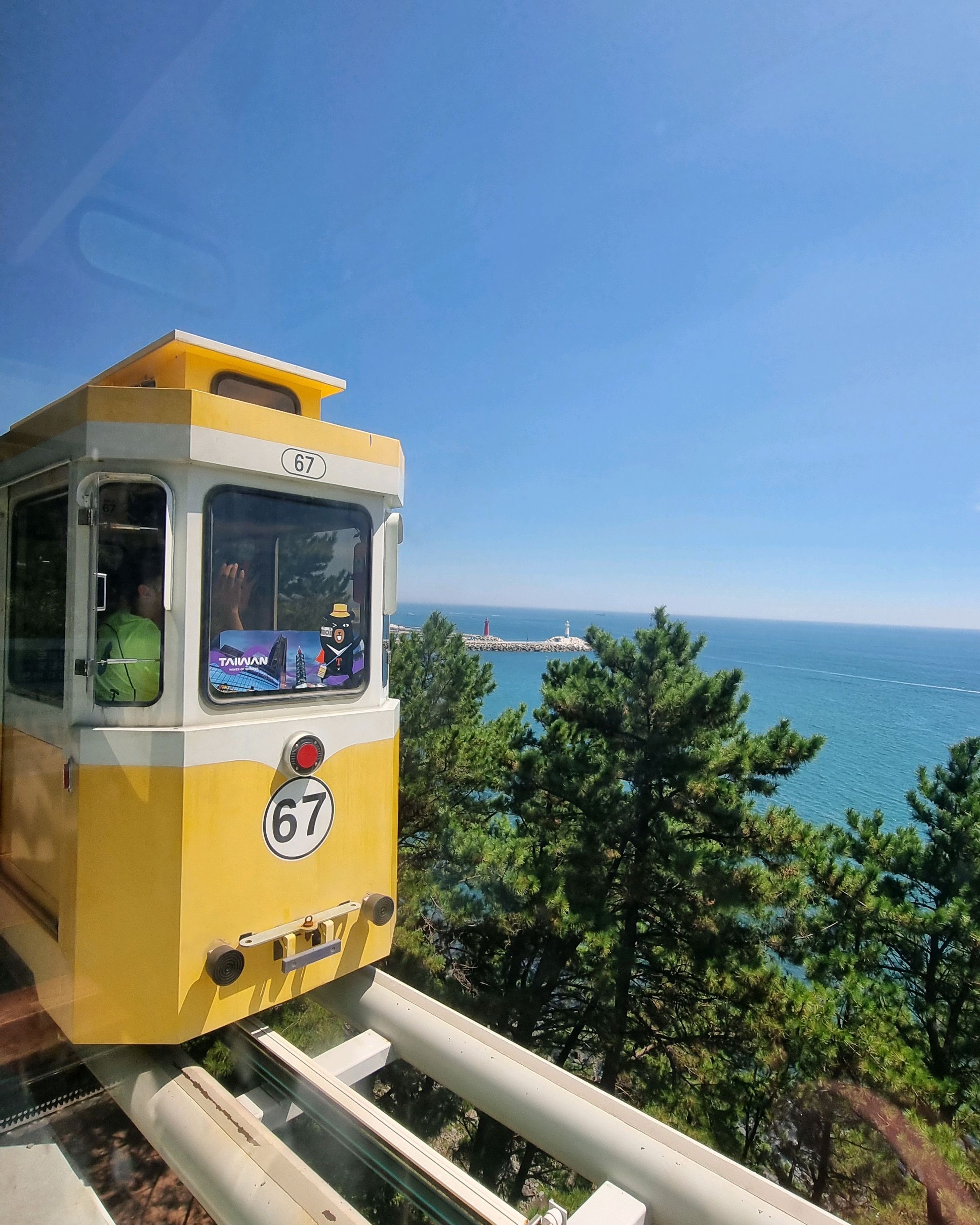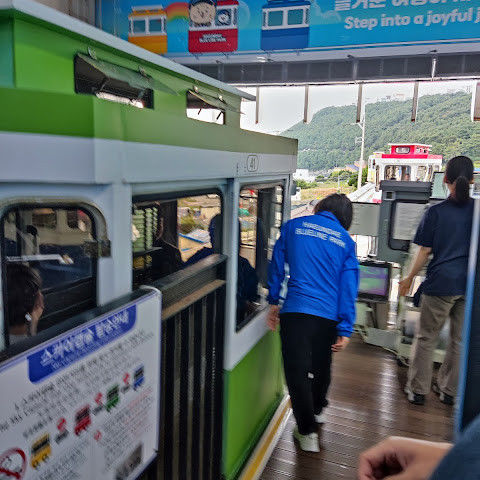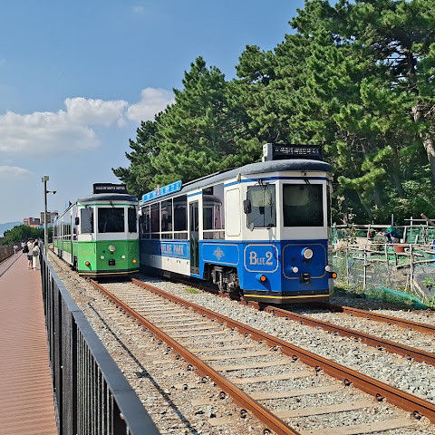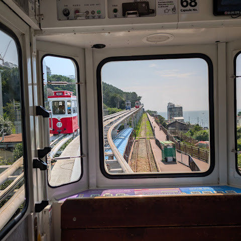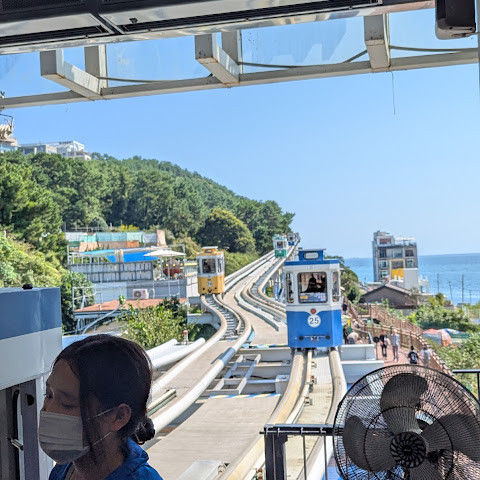 캡슐 열차가 너무 귀여워요. 에어컨은 없지만 시원한 바닷바람을 느낄 수 있어요!