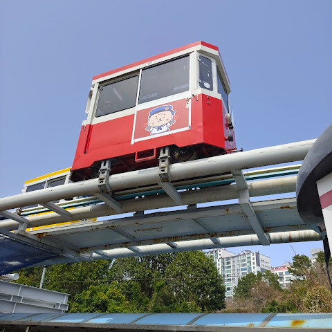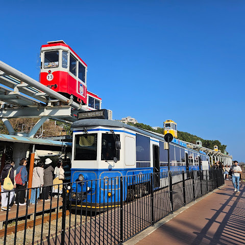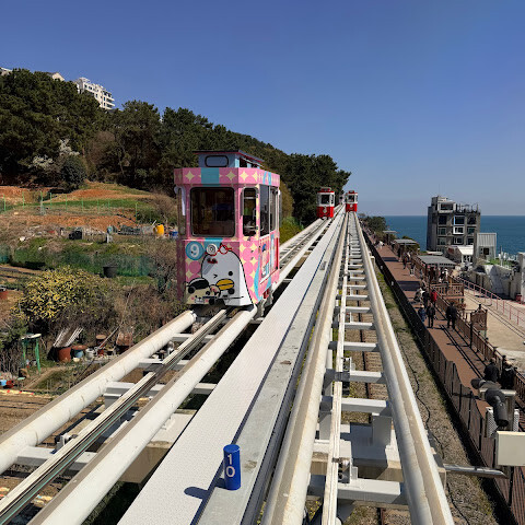 여기는 부산 캡슐 열차의 종착역입니다. 여기서 해안 열차도 탈 수 있는데, 경치가 아주 아름답습니다.