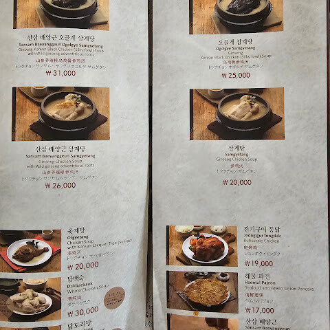 📌특징: 닭과 오골계 두 종류의 삼계탕이 있고 그 안에서도 일반 삼계탕과 산삼 배양근 삼계탕으로 나눠짐. 일반 삼계탕집에 비해서는 가격대가 조금 더 있는 편. 음식을 주문하면 아주 작은 잔에 인삼주가 서비스로 나오고 김치랑 깍두기는 직접 담구는게 확실~