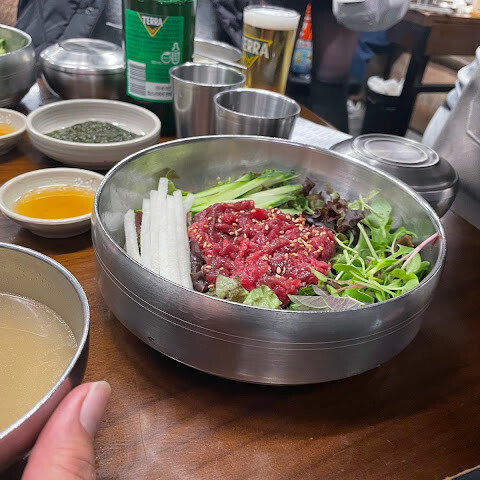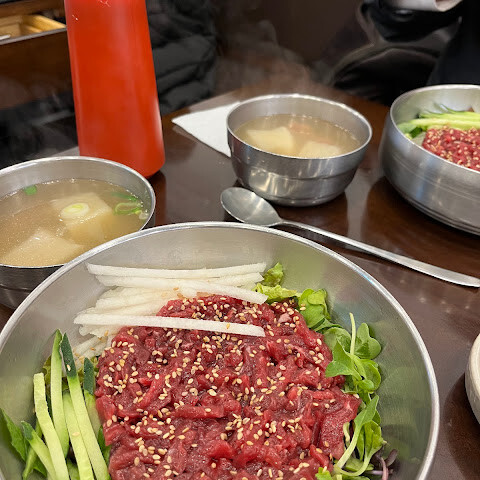 한국을 여행하면서 관광지에 몇 군데 다녀봤기 때문에 과대광고일까 봐 걱정했는데, 전혀 아니었어요. 엄청 인기 있는 곳이지만, 이곳은 정말 최고였어요. 서비스가 정말 빨랐어요. 오픈하자마자 바로 가서 대기할 필요가 없었어요. 바로 음식을 받았는데 정말 맛있었어요. 한국식 무국은 진짜 맛있었습니다. 조언 하나 드리자면, 일행 중 한 명당 한 끼씩 주문해야 해요. 저희 둘이서 육회비빔밥 하나랑 일반 육회 하나를 주문했는데, 종류가 다양해서 완벽했어요. 모두가 같은 메뉴를 먹는 것보다 훨씬 나았어요. 고기를 찍어 먹는 참기름도 제가 먹어본 참기름 중 최고였어요. 고소하고 짭짤했어요. 고기와 정말 잘 어울렸어요. 기다리지 않고 이곳을 맛보고 싶다면 일찍 가세요. 늦게 가면 줄이 더 길어질 거예요. 저희가 나올 때에도 줄이 길었어요.