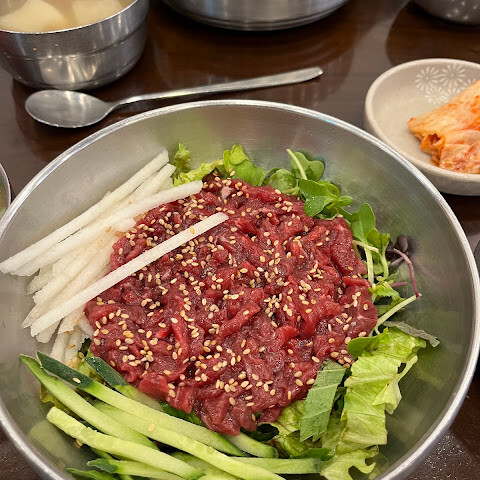 육회 비빔밥 또한 훌륭합니다. 따뜻한 밥 위에 신선한 채소와 생고기가 얹어져 나오는데, 모든 재료를 비벼 먹으면 차갑고 부드러운 육회와 따뜻한 밥의 조화가 일품입니다. 풍미 가득하고 균형 잡힌 맛에, 의외로 든든한 한 끼 식사가 됩니다. 제대로 된 한국식 육회를 맛보고 싶다면 꼭 방문해야 할 곳입니다.