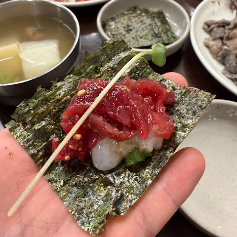 생쇠고기는 예상외로 맛있었는데, 특히 김에 싸서 먹으니 더 좋았어요. 수요일 오후 5시에 갔는데 줄이 없었어요.