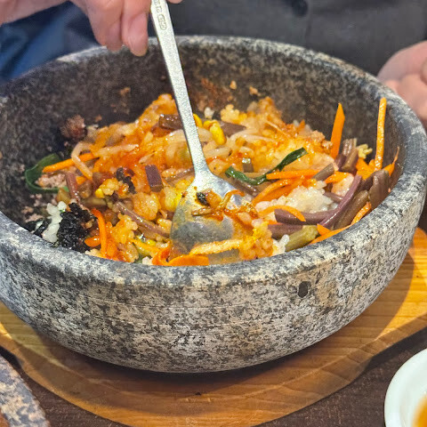 생고기 비빔밥은 진짜 제대로 된 비빔밥이었어요! 바닥에 깔린 밥에는 바삭한 누룽지가 있어서 향긋한 냄새가 더해졌어요. 아저씨께서 한국인으로서의 자부심을 가지고 직접 비벼주시겠다고 하셨어요, 하하!