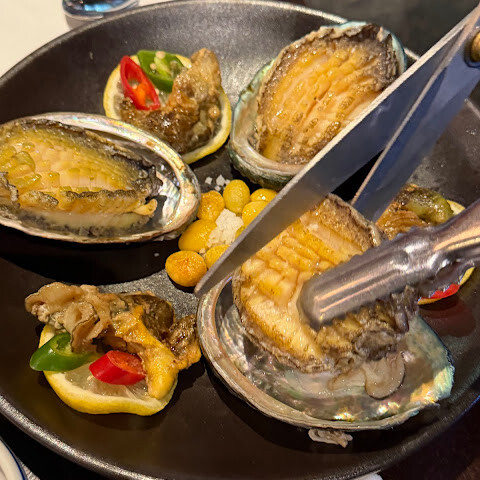 전복은 그 자리에서 수조에서 직접 건져 올린 거였고, 직원분이 직접 보여주시기도 했어요. 구운 전복은 버터 향이 은은하게 나면서 살도 두툼했어요. 전체적으로 아주 만족스러운 식사였어요!