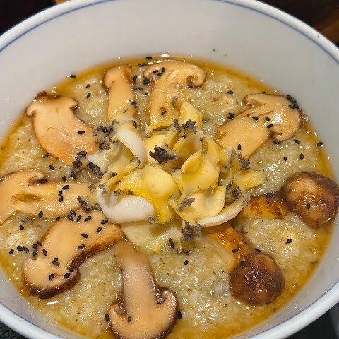 방금 전까지는 살아있는 전복을 보여주더니, 다음 순간 맛있는 죽으로 변신했습니다. 죽의 종류도 다양했는데, 저는 대표 메뉴인 송이버섯과 전복맛을 주문했습니다. 전복은 통째로 썰어 죽 위에 얹어 주었습니다.