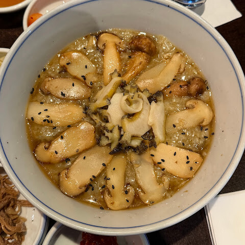 감기에 걸려서 죽이 먹고 싶었는데, 마침 이 집 대표 메뉴인 송이버섯 전복죽을 주문했어요. 죽 국물은 진하고 크리미했고, 한 입 먹을 때마다 송이버섯 향이 가득 퍼졌어요. 전복도 살이 통통하고 맛있더라고요! 웨이터분이 모든 한국식 밑반찬과 소스는 직접 만든다고 하셔서, 맛이 정말 정통 한국식이라고 하셨어요.