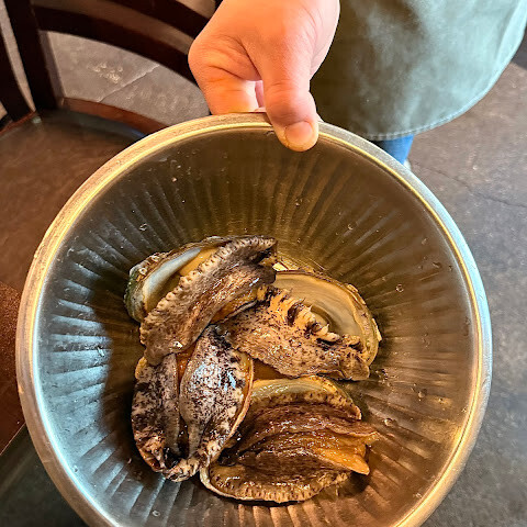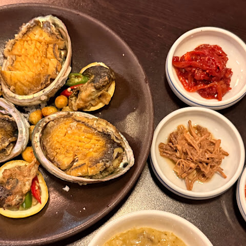 전복은 그 자리에서 수조에서 직접 건져 올린 거였고, 직원분이 직접 보여주시기도 했어요. 구운 전복은 버터 향이 은은하게 나면서 살도 두툼했어요. 전체적으로 아주 만족스러운 식사였어요!