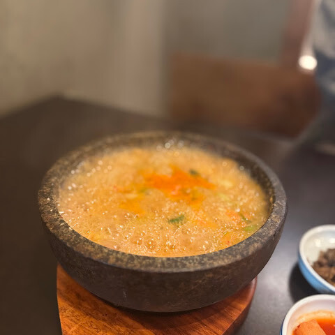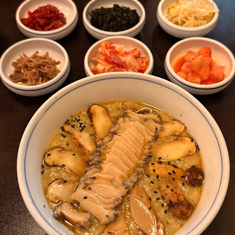 감기에 걸려서 죽이 먹고 싶었는데, 마침 이 집 대표 메뉴인 송이버섯 전복죽을 주문했어요. 죽 국물은 진하고 크리미했고, 한 입 먹을 때마다 송이버섯 향이 가득 퍼졌어요. 전복도 살이 통통하고 맛있더라고요! 웨이터분이 모든 한국식 밑반찬과 소스는 직접 만든다고 하셔서, 맛이 정말 정통 한국식이라고 하셨어요.