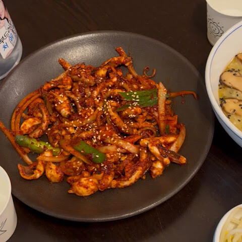 매콤한 낙지볶음은 낙지와 양파에 소스가 골고루 묻어 있었어요.