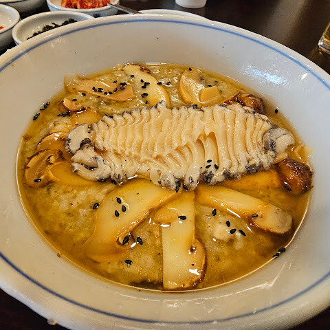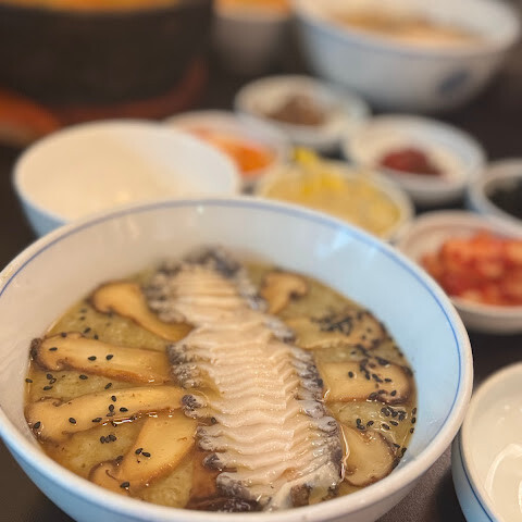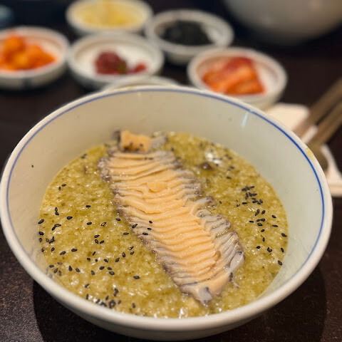 사장님이 직접 살아있는 전복을 요리하기 전에 보여주시는데, 정말 신선했어요! ✨꼭 시켜보세요: 전복죽✨ 얇게 썬 전복이 그릇을 가득 채우고 있어요. 쫄깃하고 달콤한 식감에 송이버섯 향이 은은하게 퍼져서 정말 맛있어요. 따뜻하게 마시면 속이 편안해지는 느낌이에요. 참기름을 살짝 뿌려 먹으면 그 맛은 환상적이에요!!