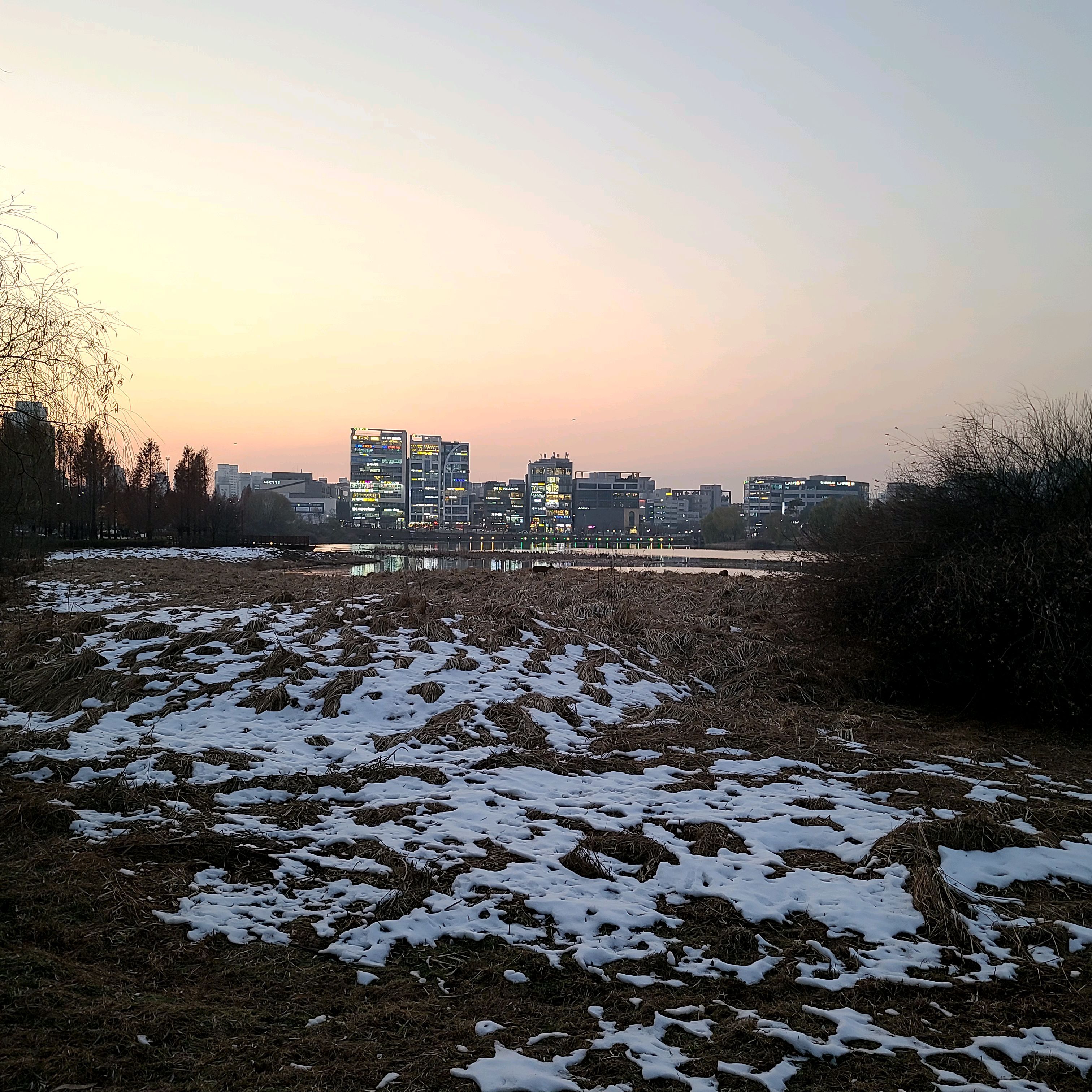 눈 내린 수변 공원 노을이 넘 예뻐요