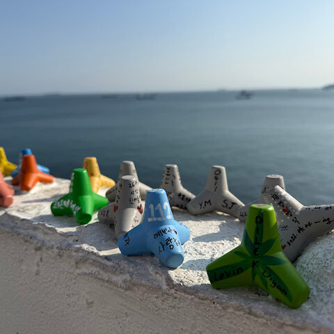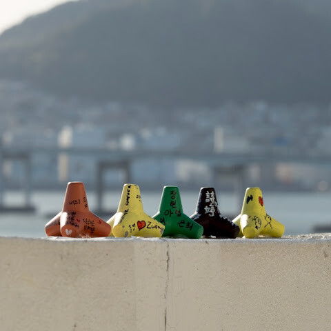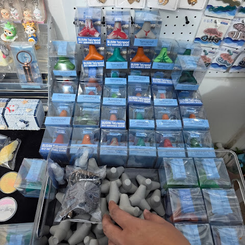 여기는 시원한 가게들이 많네요. 바람이 세게 불고 햇볕이 강할 수 있으니 자외선 차단제 꼭 바르세요. 테트라포드 아이디어도 좋고, 귀엽게 표현한 것도 마음에 들어요.