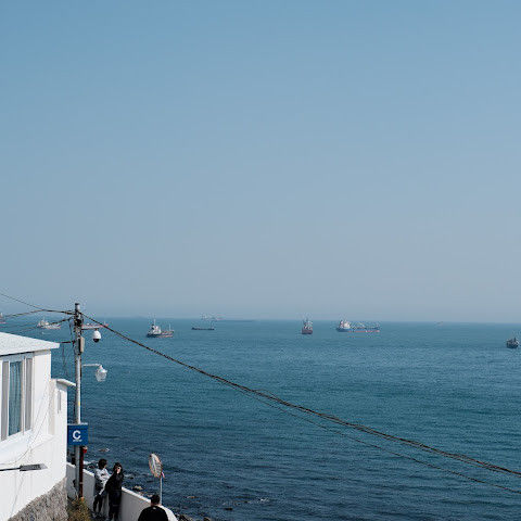 부산 흰여울마을. 겨울바다가 보이는 풍경에 배가 바다위에 가득 떠 있다. 이국적인 풍경에 현실적 삶이 담긴 흰여울마을. 계속걸으면 태종대까지 연결되는 바닥길이 있다. 바다가 마을을 품고 있다