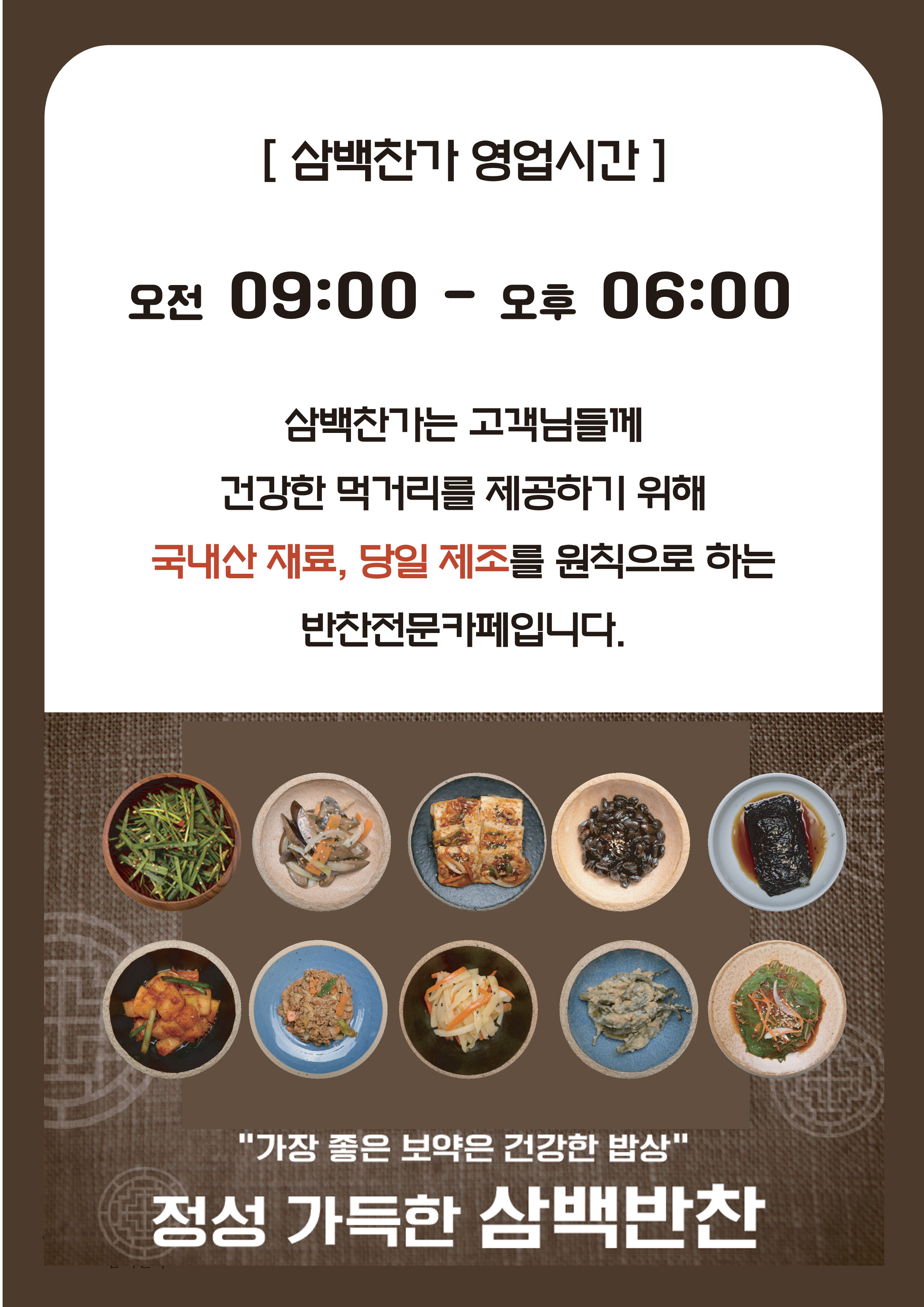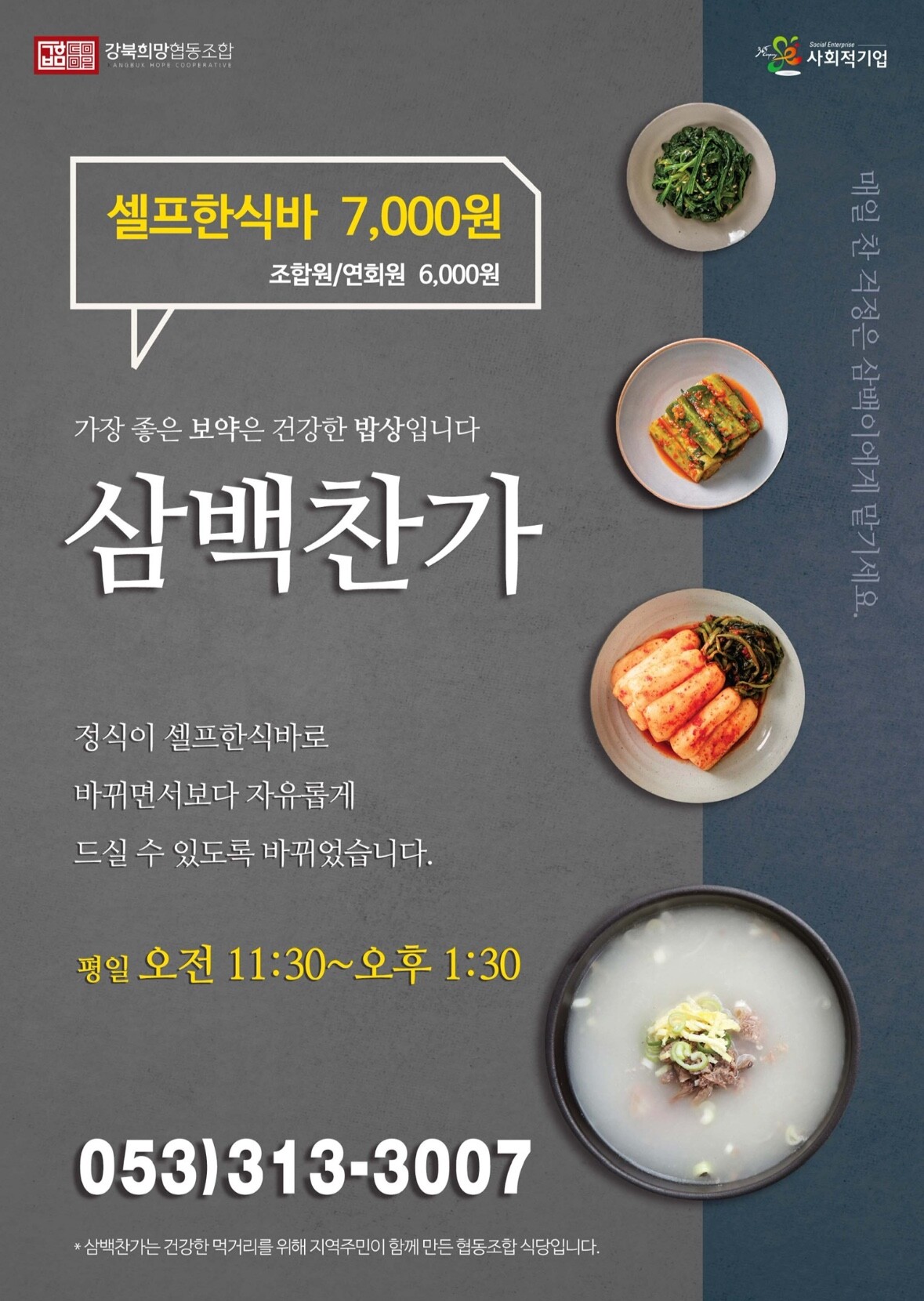 대구 북구 칠곡 동천동 자연드림 2층에 입점해 있는 삼백찬가는 건강한 먹거리와 공동체를 위해 지역주민들이 출자하여 만든 ‘강북희망협동조합’의 조합원들의 뜻이 모여 만들어진 반찬가게이다.