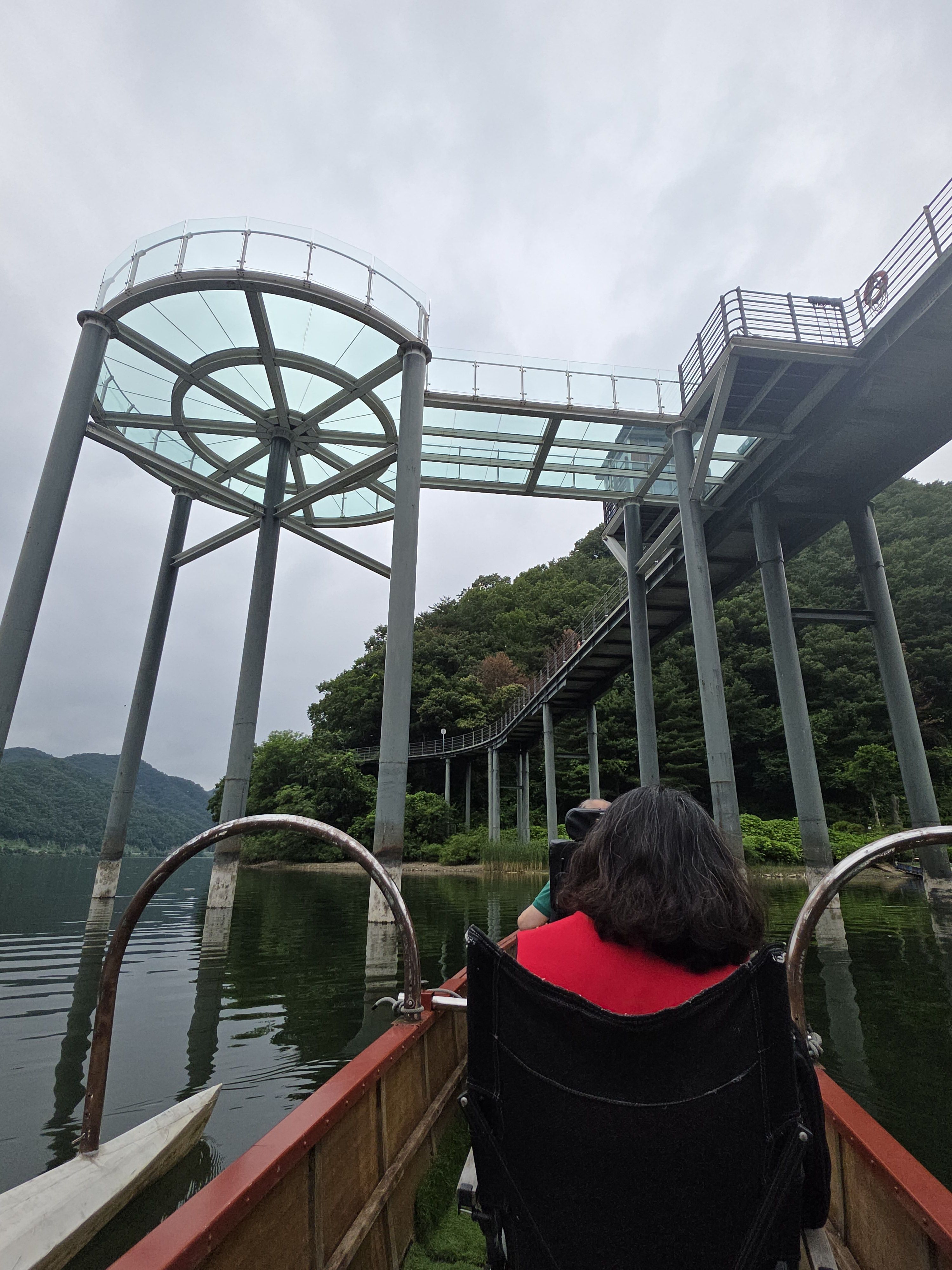 휠체어 타시는 어르신과 함께 다녀왔어요. 말로만 듣던 킹카누, 생각보다 훨씬 안전하고 편안해서 좋았습니다. 카누 양옆으로 균형장치가 있어서 카누 안에서 걸어다니고 한쪽에 앉아도 기우뚱하지 않고 생각보다 넓어서 여러 사람이 타기도 좋았어요. 직접 노를 젓는 게 아니라 모터로 움직이고 안전요원분이 함께 타셔서 여러 가지 설명도 해주셨어요. 의암호 스카이워크 아래로 지나는 건 사람이 없을 때만 할 수 있어서 운이 좋은 거라고 하시더라고요~
