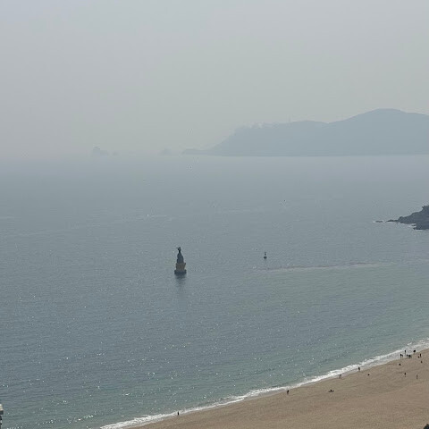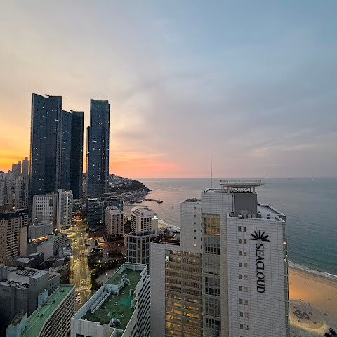 이 사진은 새벽 5시 50분쯤 방에서 찍은 거예요. 정말 아름다운 풍경이고, 해운대 근처에 오신다면 꼭 한번 묵어보시길 추천해요!
