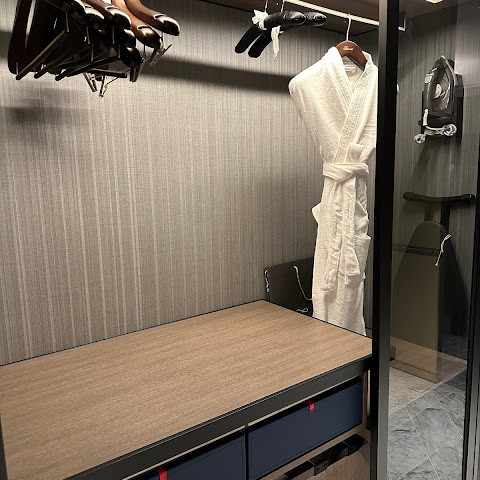 방은 정말 넓고, 공간도 넉넉하고, 버튼 하나만 누르면 커튼도 조절할 수 있어요. 베개가 더 좋았으면 좋았을 텐데, 딱딱한 베개나 메모리폼 베개는 몇 분 안에 얇아지거든요. 욕실은 디자인이 좀 아쉽네요. 세면대가 좀 불편하고, 디자인 때문에 물건을 놓을 공간이 부족해요. 작은 테이블이 있는데, 좀 작아요. 이제 슬라이딩 도어가 있는 입구가 두 개 있는데, 필요 없을 정도로 사생활이 침해되고, 세 번째 슬라이딩 도어가 욕실 전체를 방으로 연결해줘요. 샤워실과 화장실은 같은 슬라이딩 도어를 공유해서 한 번에 닫을 수 있고, 둘 다 동시에 닫을 수는 없어요. 샤워할 때 물이 새어 욕실이 젖어서 수건을 덮어서 막아야 해요.