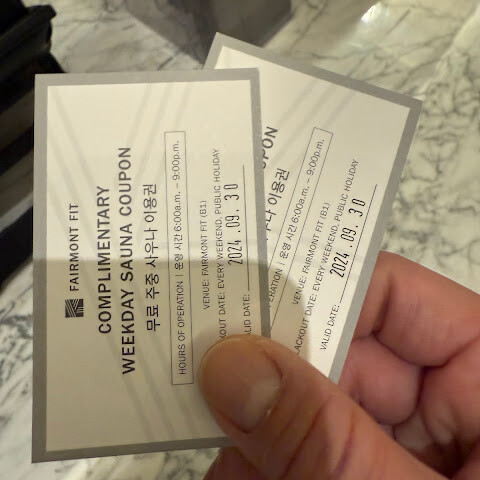 아쉽게도 투숙 기간 동안 몇 가지 문제가 있었습니다. 호텔에서 보낸 이메일에는 다른 사람의 영어 이름이 사용되었고, 객실에 비치된 웰컴 카드에도 다른 사람의 이름이 적혀 있었습니다. 또한, 사우나 이용권 두 장이 동봉된 봉투를 받았는데, 헬스장 카운터 직원에게 문의했더니 유효기간이 지났다고 했습니다. 마치 제가 유효기간이 지난 이용권을 사용하려 했던 것처럼 오해가 생겼습니다. 하지만 이번이 첫 투숙이었고, 이용권은 호텔에서 제공한 것이었습니다.