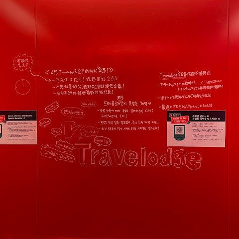 트래블로지는 외국인 관광객을 대상으로 하는 것 같습니다. 엘리베이터 벽에는 낙서가 있고 곳곳에 만화 같은 글씨체를 사용하는 등, 마치 고급 유스호스텔처럼 보이려는 것 같습니다.
