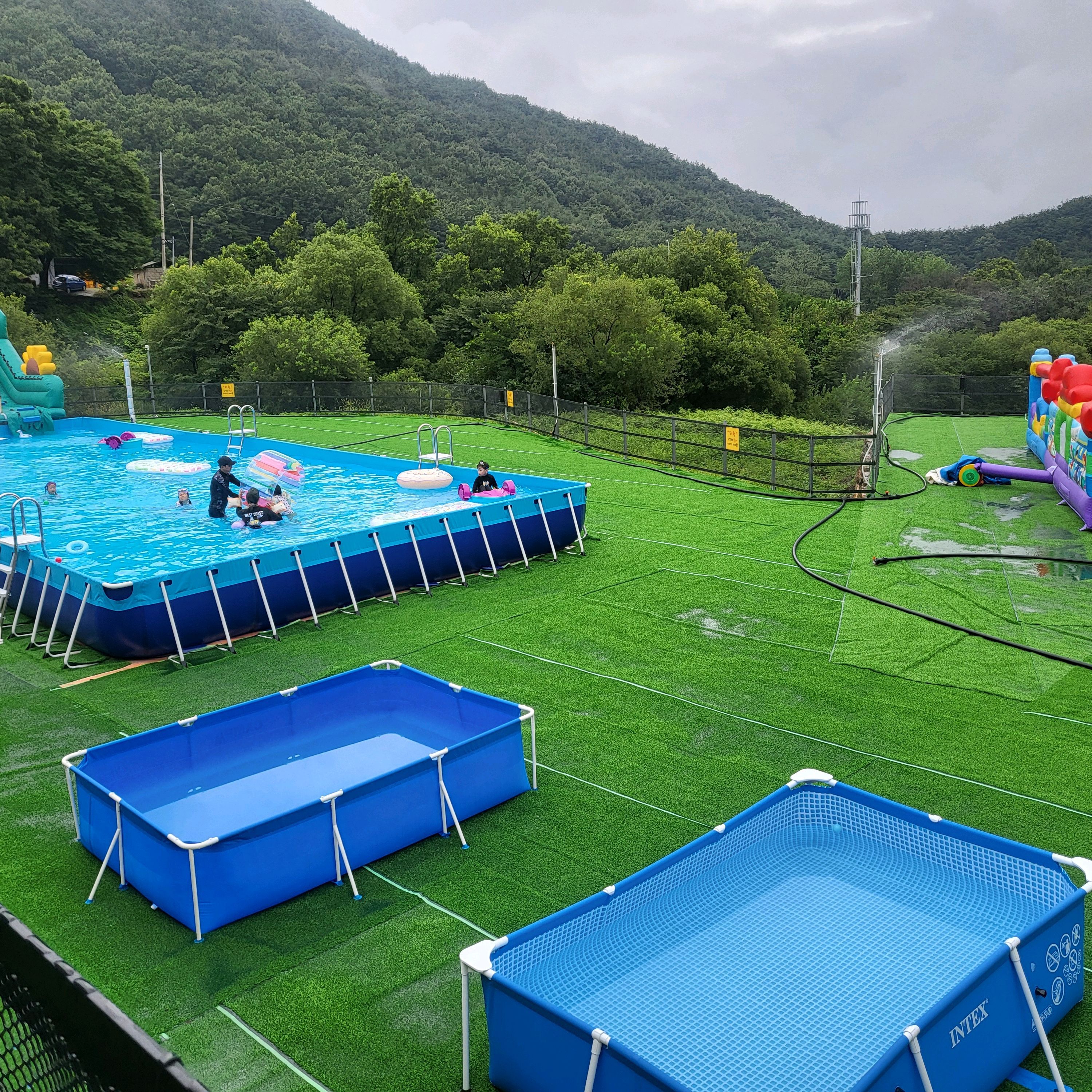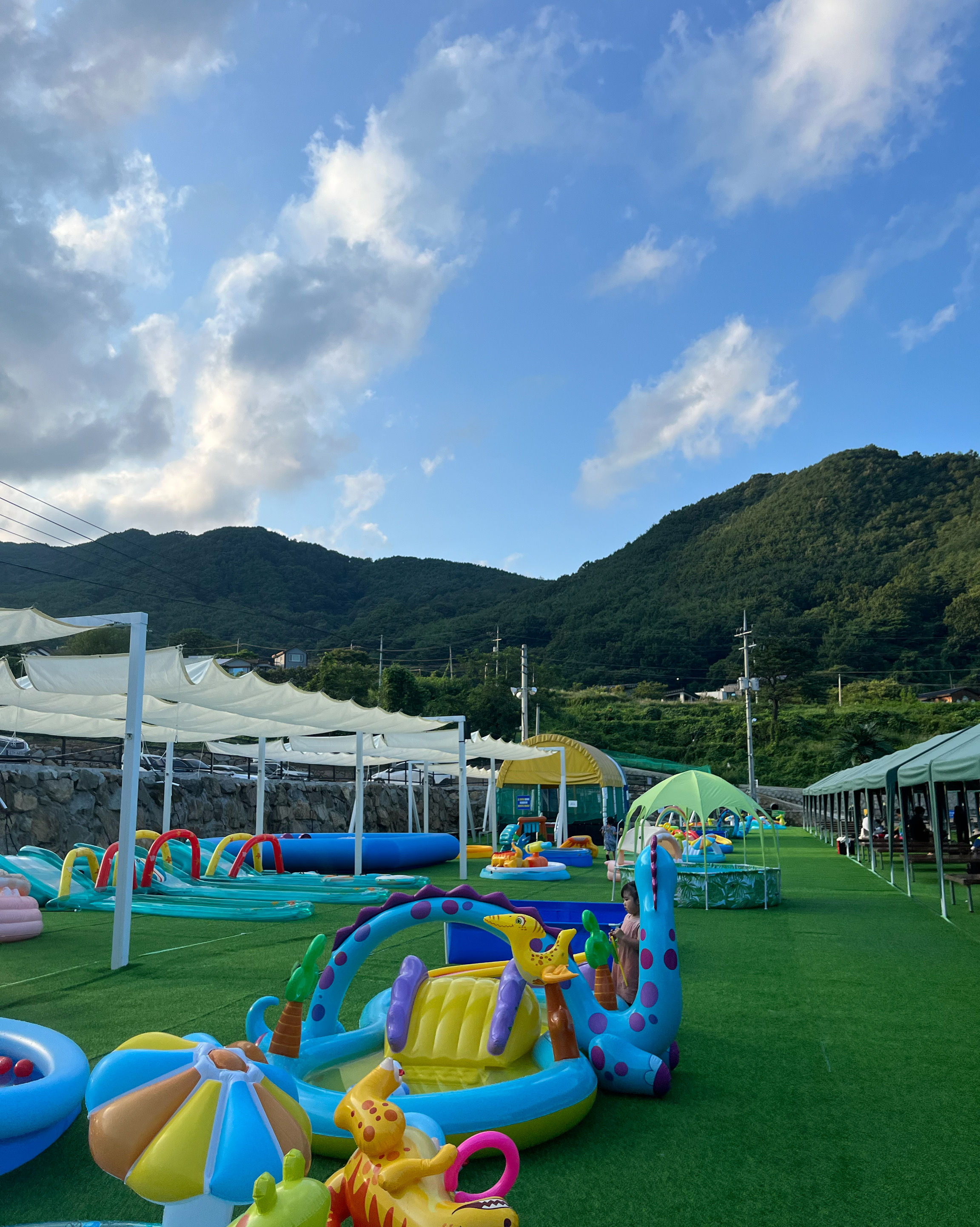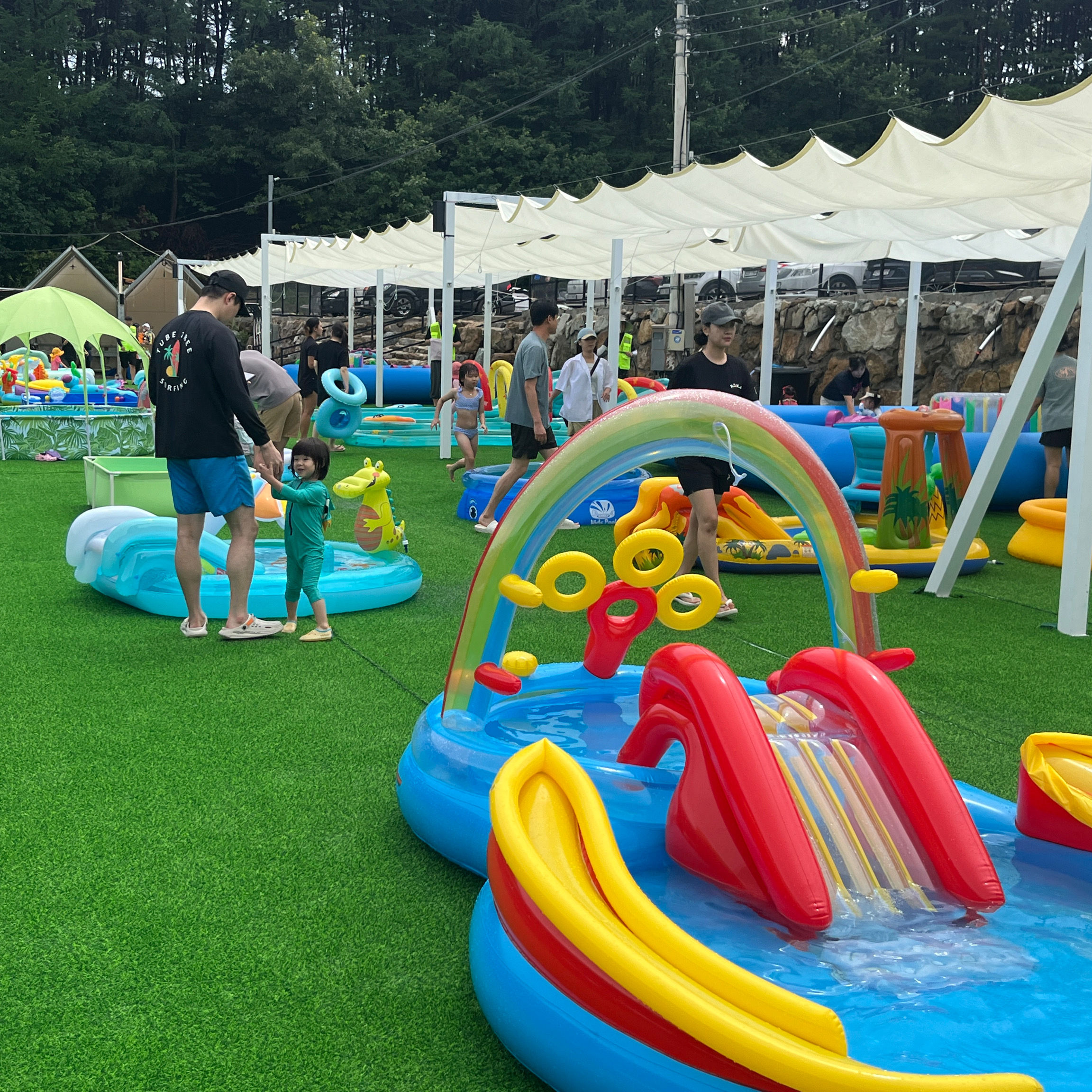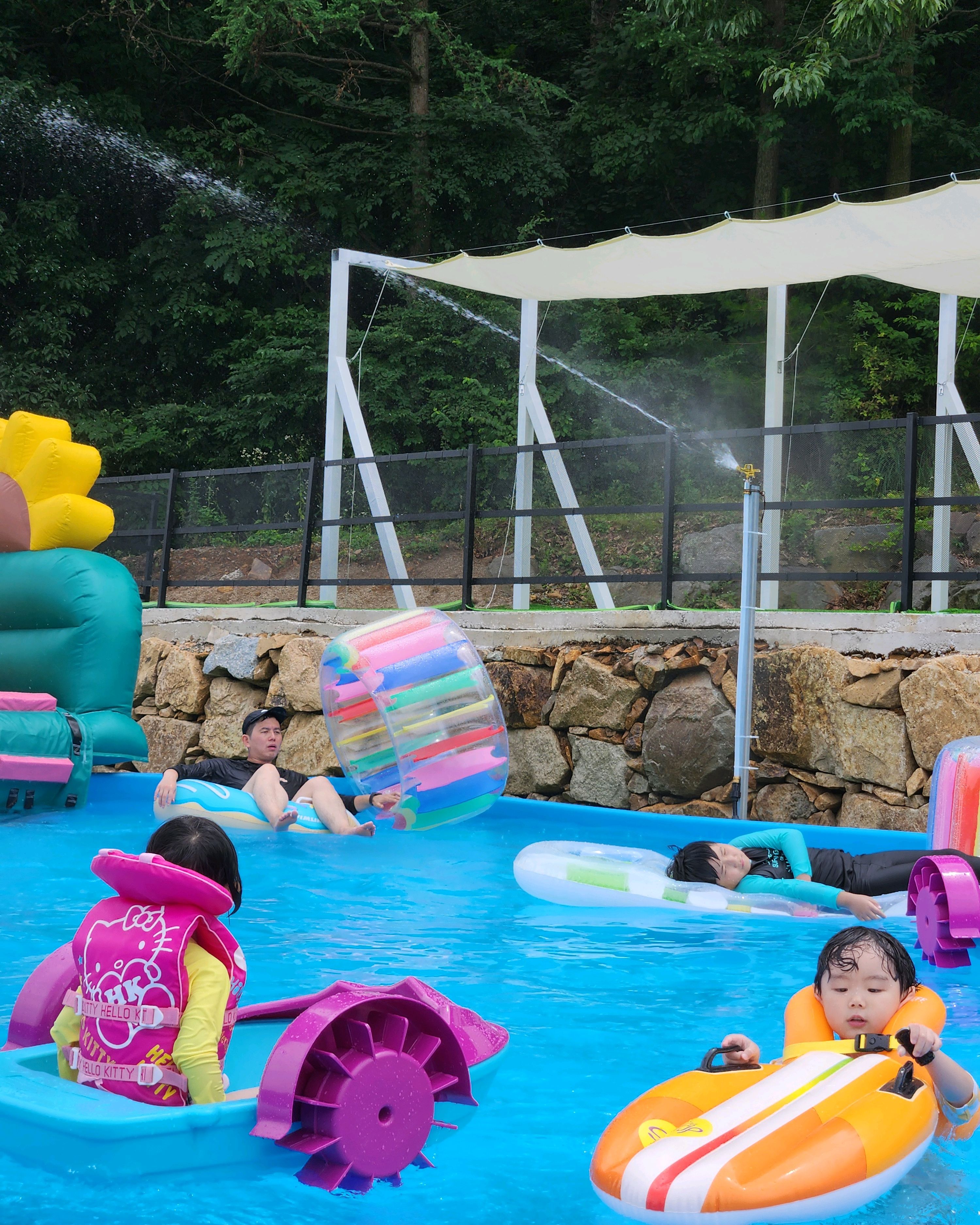 아이랑 가기 너무 좋아요! 평상간 거리도 넓직해서 불편하지 않았고, 두돌아기 놀기 좋은 물놀이공간이 바로 앞에 있어서 마음 놓고 놀 수 있었어요~! 장마라 제가 갔을땐 오전에 비가 왔는데 빗물 다 닦아주시고 놀때는 벌레 계속 건지는거 보면서 관리가 잘되는게 보였어요~! 밑에는 큰애들 에어바운스도 재밌어보였고, 토끼도 있어서 볼거리 많아요! 먹을거도 바베큐세트나 밀키트 있어서 빈손으로 가도 좋을 것 같아요! 또 놀러갈게요~