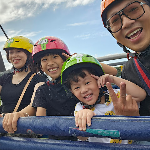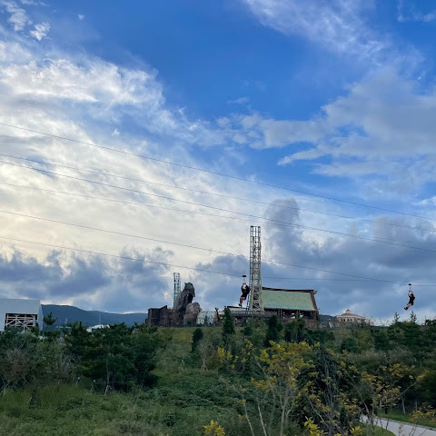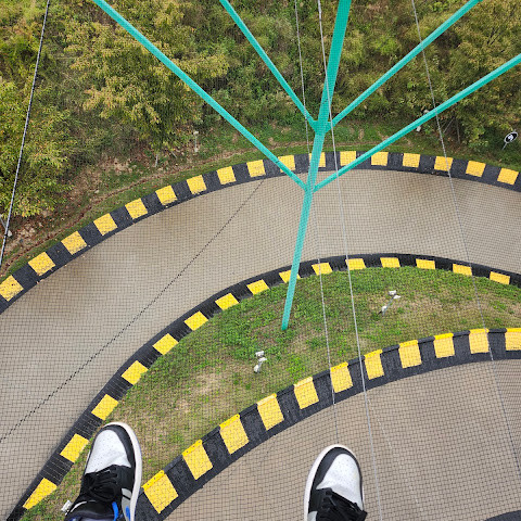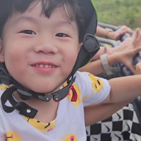 처음에는 오른쪽 레인으로 짚라인을 탔습니다. 직원이 짚라인 이용 방법을 간략하게 설명해 주었습니다. 두 번째 왼쪽 레인으로 짚라인을 탔을 때는 직원이 직접 짚라인을 건네주었습니다. 정말 가볼 만한 가치가 있습니다! 제가 흥분해서 떠드는 모습이 주변 카메라에 자주 잡혔으니 항상 표정을 잘 조절해야 합니다. 🤣 사진은 언덕을 내려온 후 찍은 거예요. 헬멧에 있는 QR 코드를 탭하면 전체 여행 사진이 표시됩니다. 사진을 구매하려면 안내에 따라 주문 번호를 적어 직원에게 주시면 됩니다.