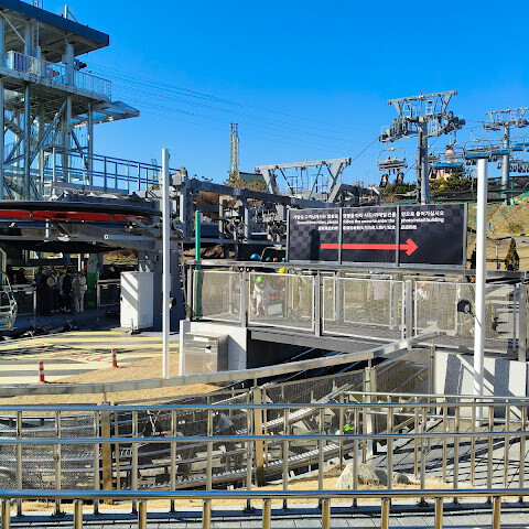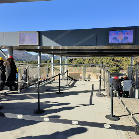 먼저 헬멧을 쓰고 줄을 서서 탑승하세요. 1월이라 그런지 좀 쌀쌀하니 따뜻하게 입고 가세요. 멋진 전망과 바로 옆 놀이공원이 보여요. 정상까지 3분도 안 걸려요. 재밌는 건, 역에 도착하면 직원분들이 중국어로 빨리 내리라고 재촉한다는 거예요! 😂