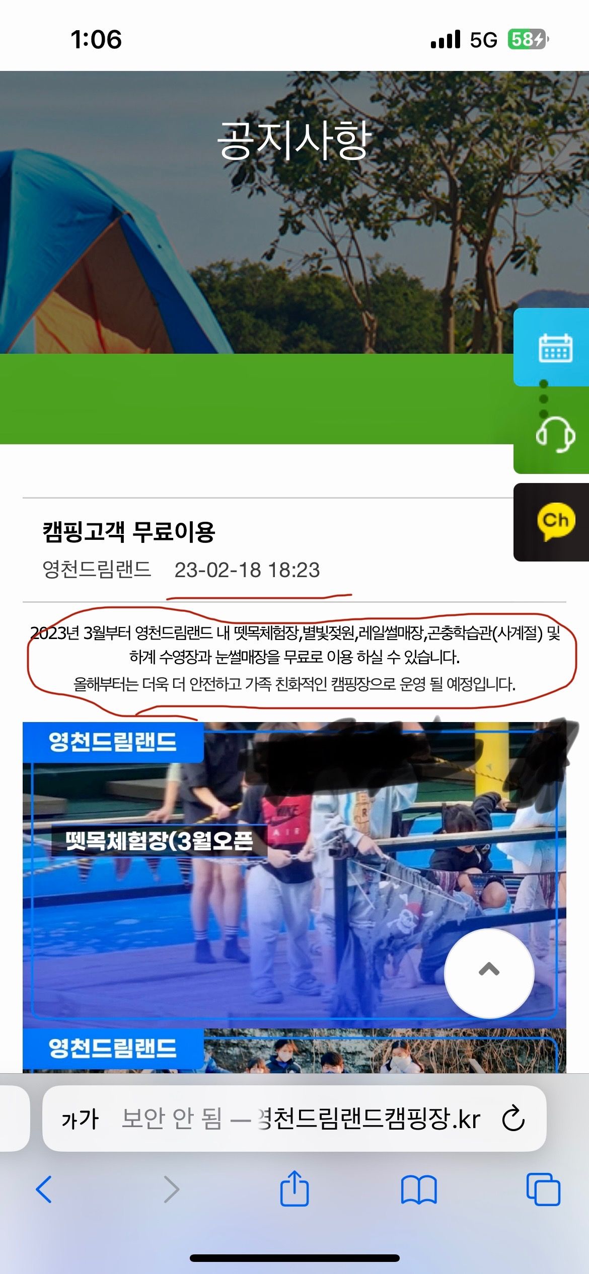 불만 : 홈페이지 게시글에 캠핑고객 23년 3월부터 무료로 수영장 이용가능하다는 글 있지만 가서 얘기하면 글 못내린거라고 말씀하시면서 돈 받음