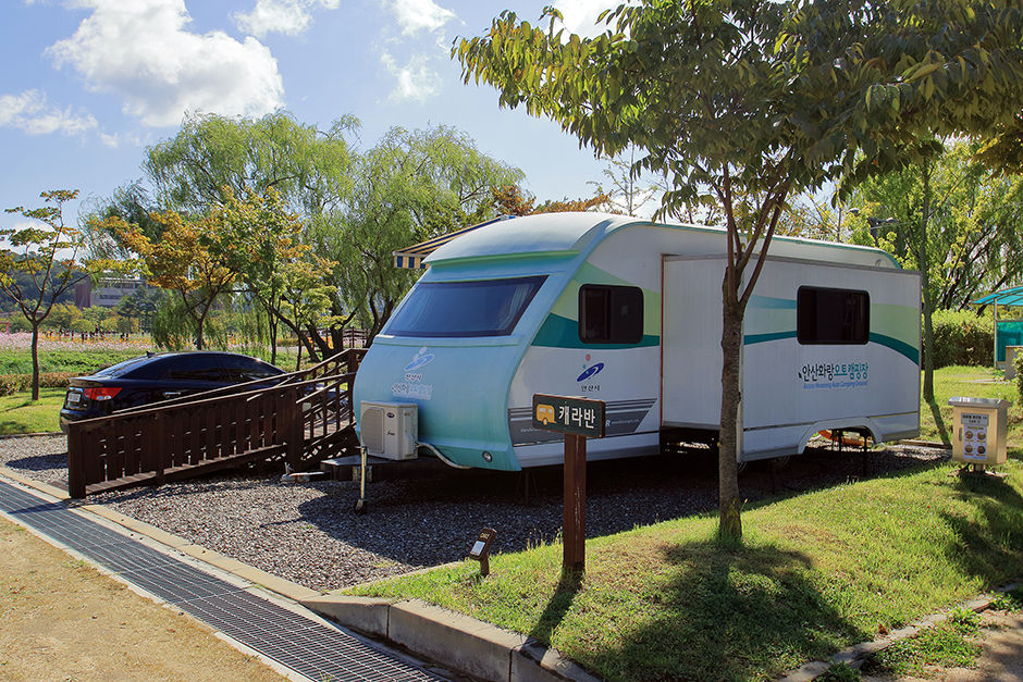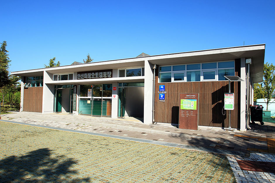 안산화랑오토캠핑장은 경기도 안산시 단원구에 위치하고 있는데, 시흥대로를 타고 지하철 4호선 초지역 방면으로 달리면 도착한다. 도심 속에 있지만 내부로 들어서면 숲 한가운데 있는 듯한 기분이 드는데, 캠핑장을 둘러싼 화랑유원지와 화랑저수지 덕분이다. 오토캠핑장은 A~K 구역에 81면이 있고 전기 사용이 가능하지만 별도의 이용료를 내야 한다. 캐러밴은 4면이 있으며, 1대만 상주하고 나머지는 캐러밴을 가지고 오는 캠퍼를 위해 조성했다. 매점이 없지만, 오토캠핑장에서 자동차로 5분여 거리에 대형마트가 있다. 관리소가 자리한 건물에는 샤워장, 화장실, 개수대가 함께 있는데, 샤워장은 관리소에 상주 사이트를 이야기한 후 비밀번호를 부여받아 이용할 수 있다.