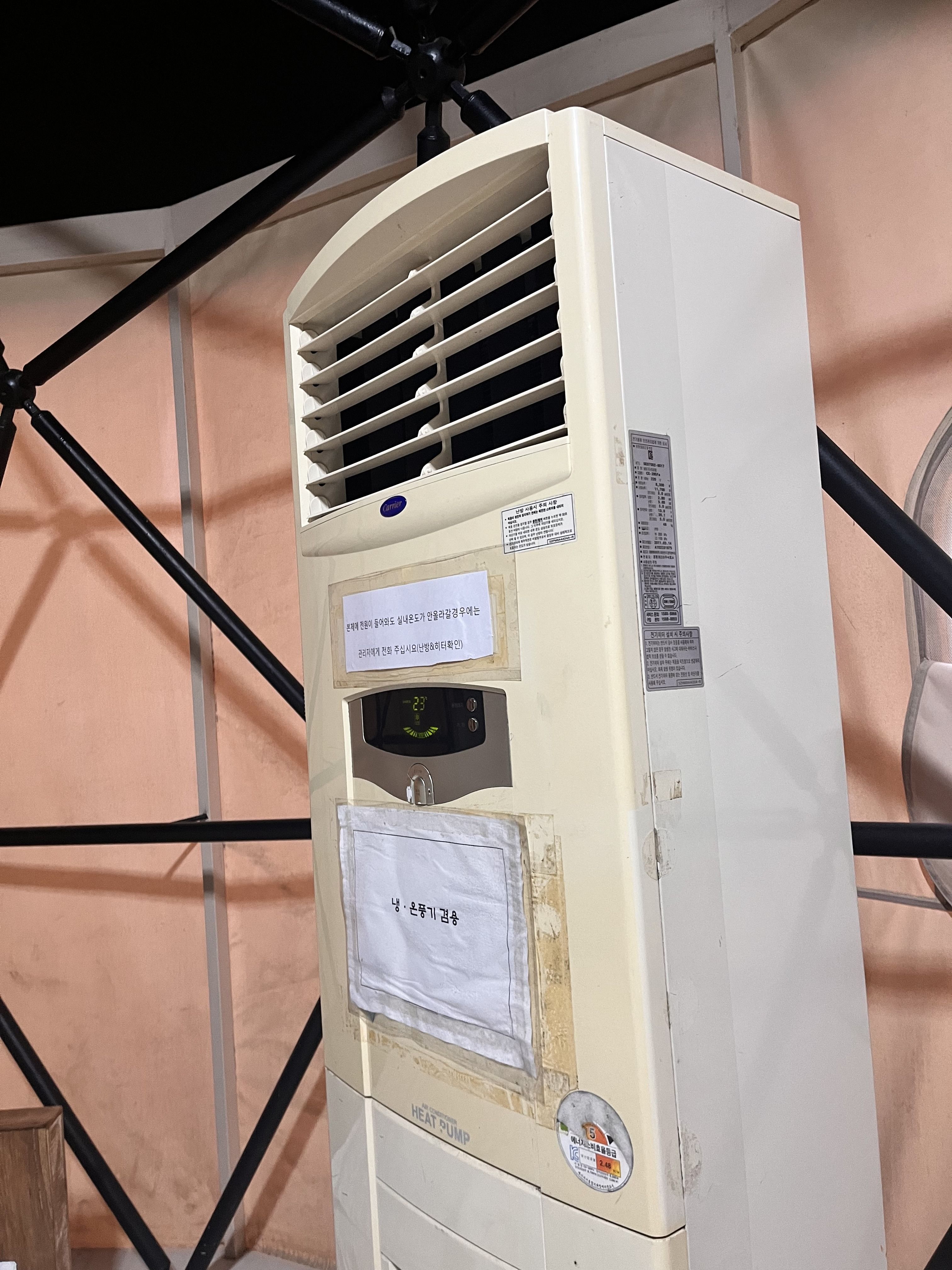 7. 오픈 1년차, 기온 35도에 사진 속 누런 에어컨, 선풍기