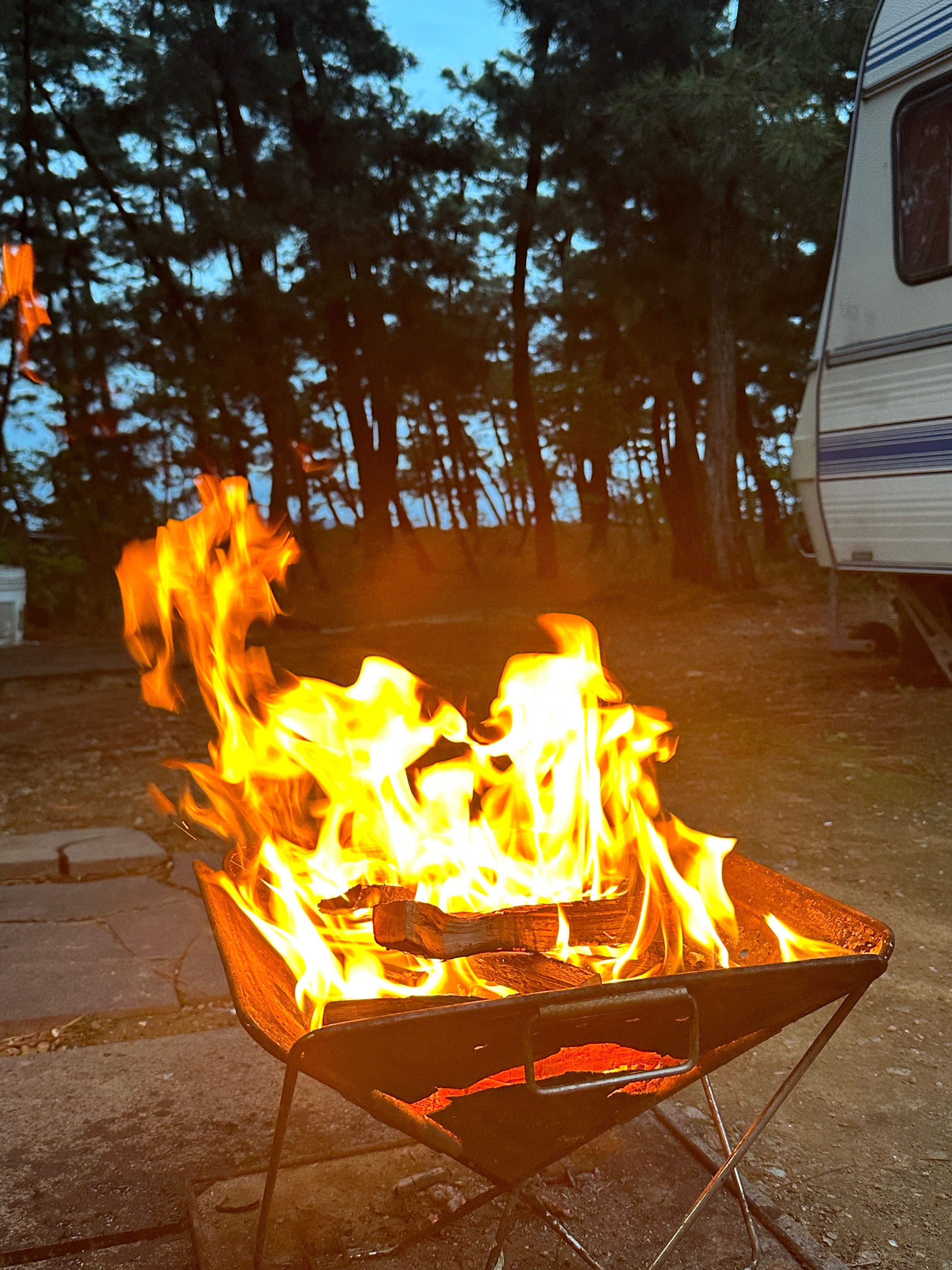 비가와서 더 운치있는 캠핑이 되었네요. 불멍은 사진처럼 시도했으나 바로 제지당해 이것만 하고 끝내겠다고 했어요. 잠깐의 불멍이었지만 아이들이 좋아했어요. 카라반안에 화장실이 좁아 샤워나 큰볼일은 공용시설 이용하셔야해요. 즤식구는 안씻고 1박하고 왔어요.