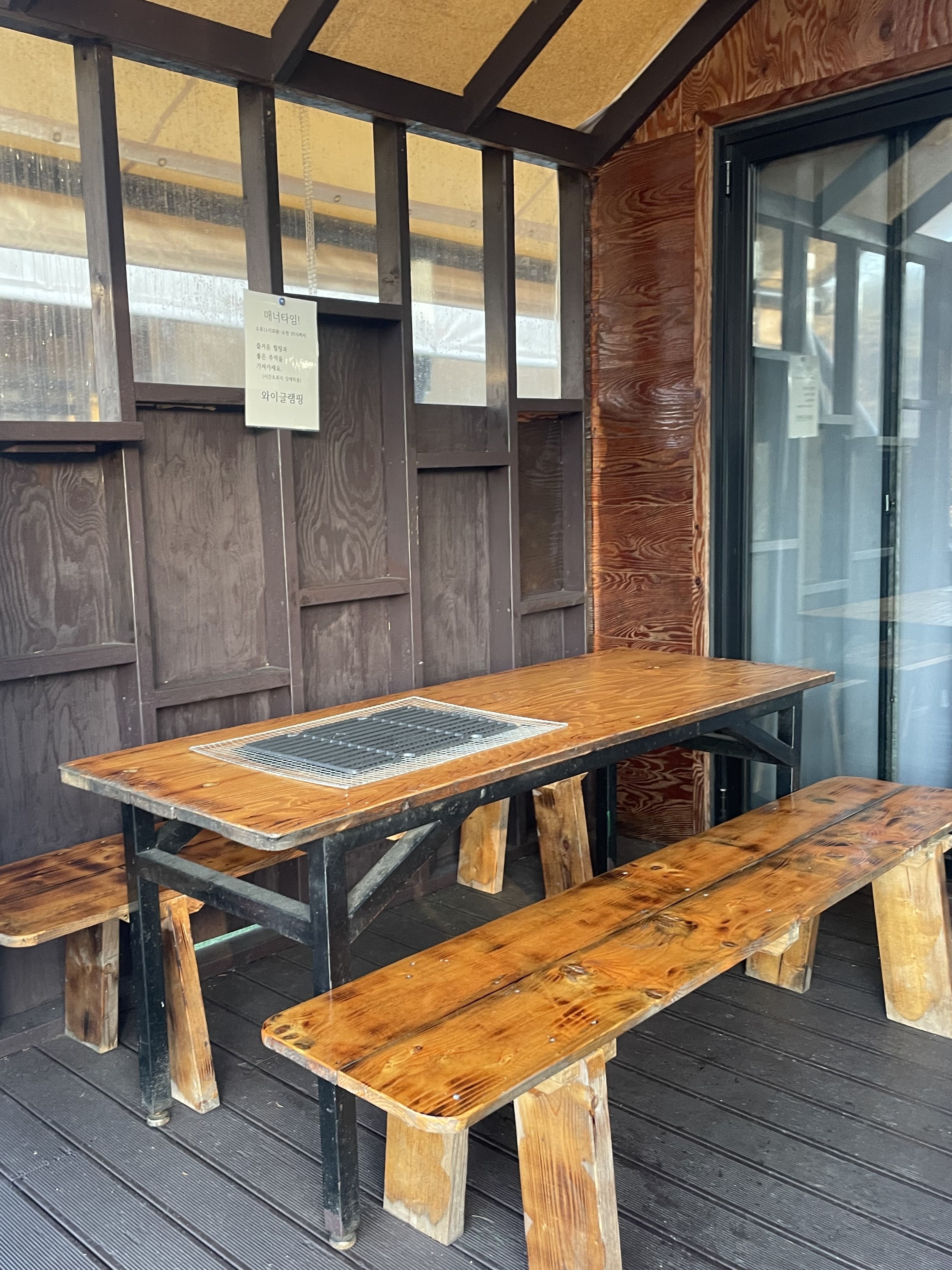 방 바로 앞에서 바베큐를 먹을 수 있는데 문이 하나 더 설치되어 있어 추운날씨에도 해먹기 좋아요