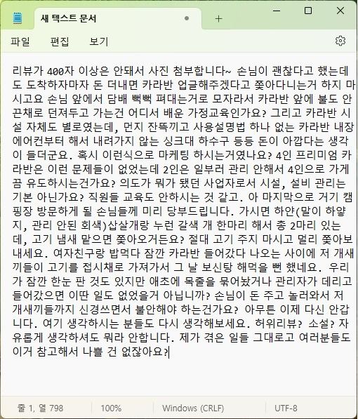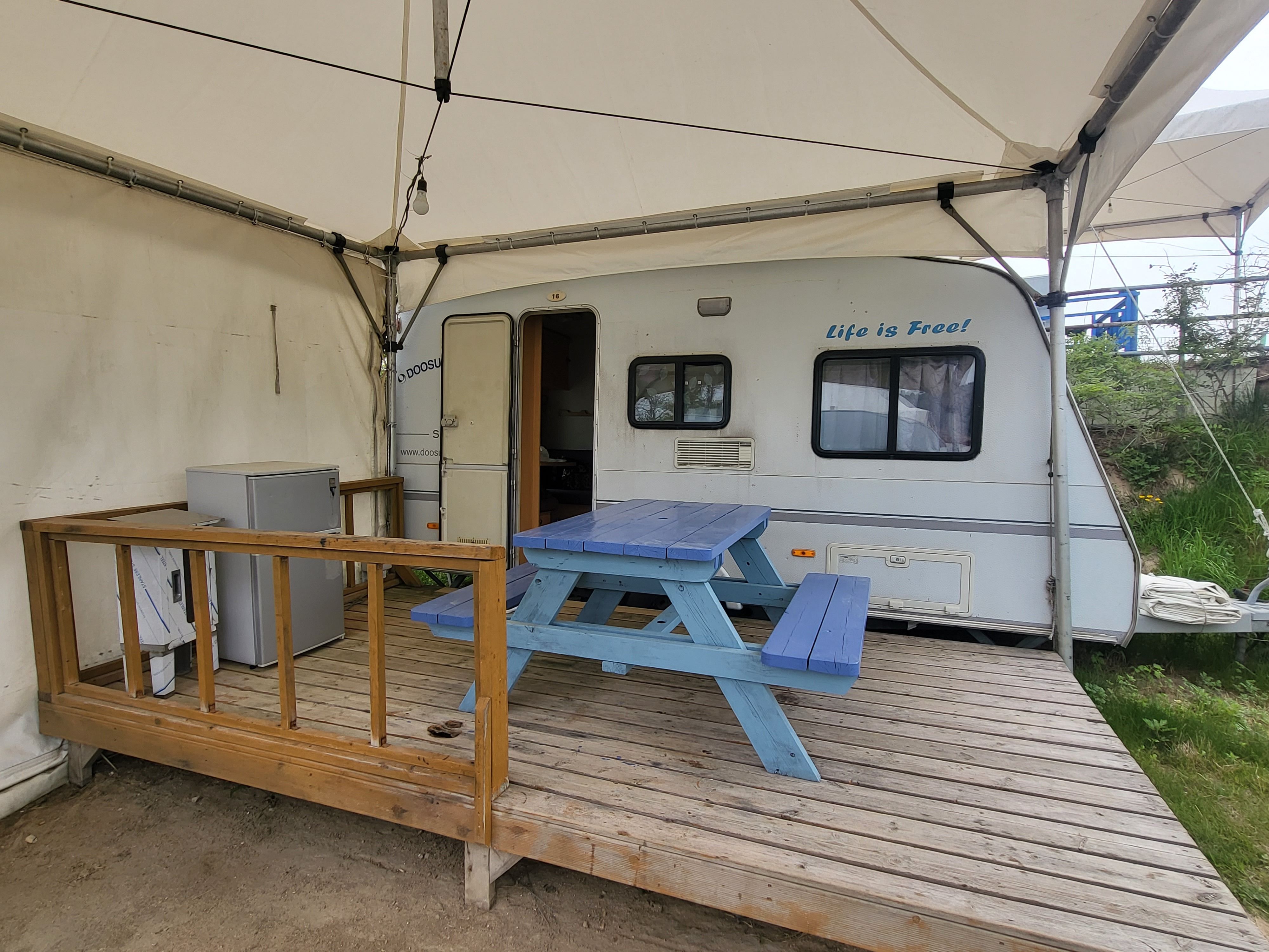 두 번째 방문하고 리뷰를 쓰려고 보니 결제를 여자친구가 해서 첫 번째 리뷰까지 찾아와서 수정합니다. 첫 방문 때는 생각보다 괜찮게 썼어요. 5/15~16에 방문했던 두 번째가 문제였어요. 사장님, 허위리뷰라고 생각하신다면 저 날짜에 최*선으로 예약한 기록 찾아보시고요. 다시 본론으로 돌아와서, 첫 방문 때 계셨던 사장님 대신 조선족 아저씨 한 분만 계셨는데 도착하자마자 다짜고짜 돈 더내면 카라반 업그레이드 해주겠다고 하더군요. 그리고 바베큐는 나중에 요청하겠다 분명히 말씀드렸는데 바닷가에서 놀고오는 사이에 이미 절반 이상 탄 채로 설치돼 있더군요. 그래서 나중에 요청하겠다 했다고 했는데 왜 해놓으셨냐고 여쭤보니 퉁명스럽게 다시 갖다 주시겠다며 손님 앞에서 피던 담배를 저희 카라반 앞에 던져놓고 가시더라고요.