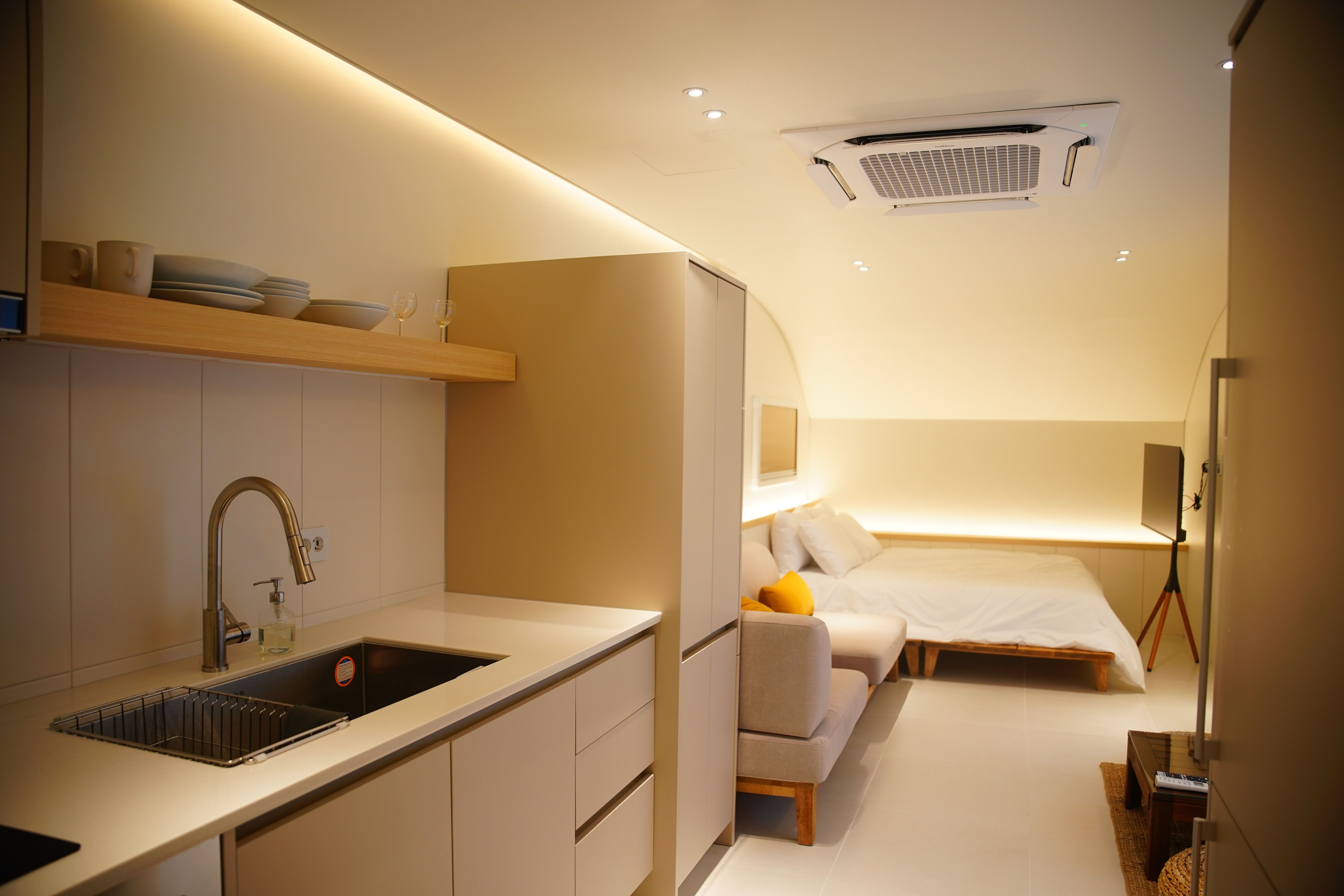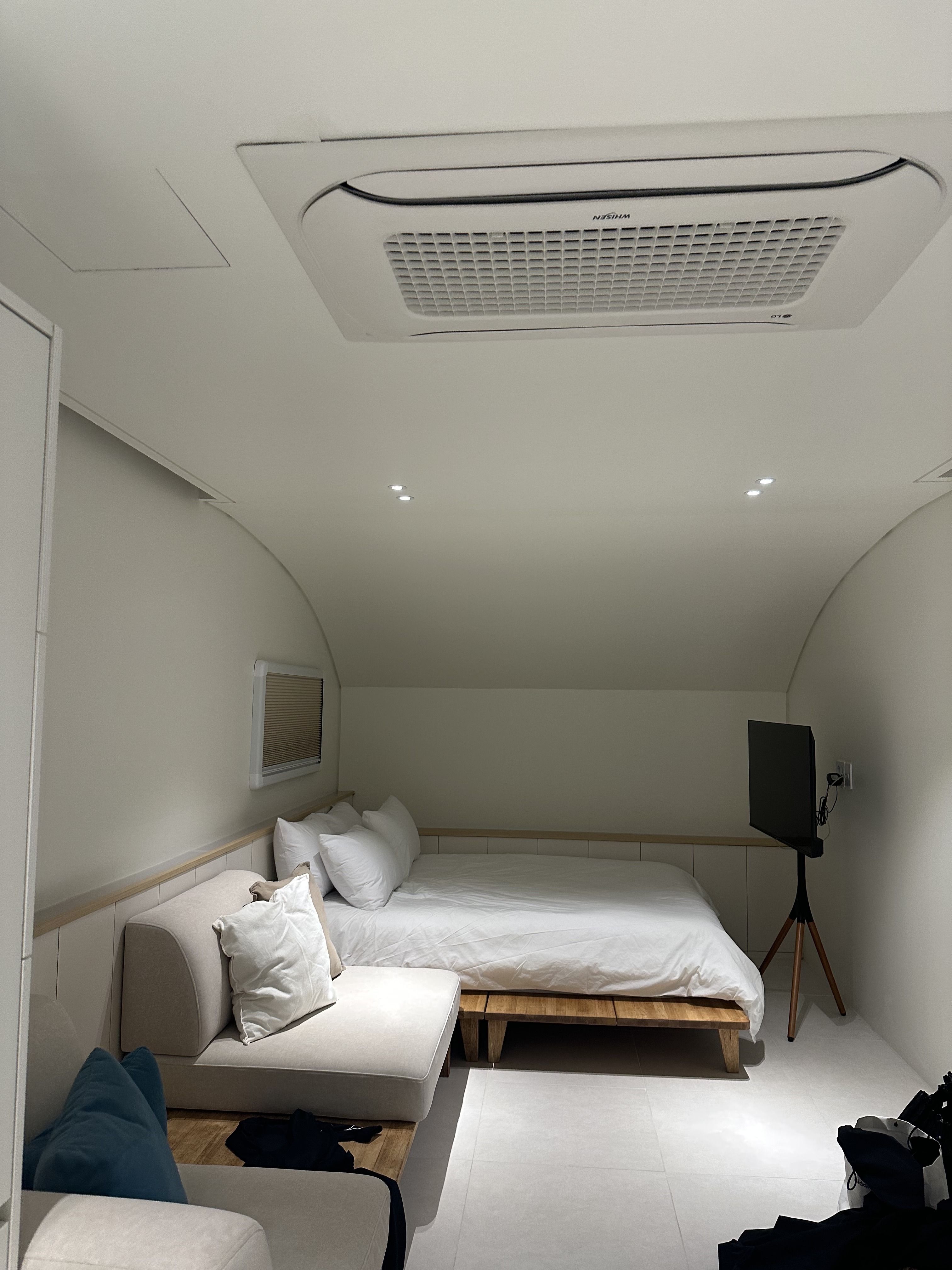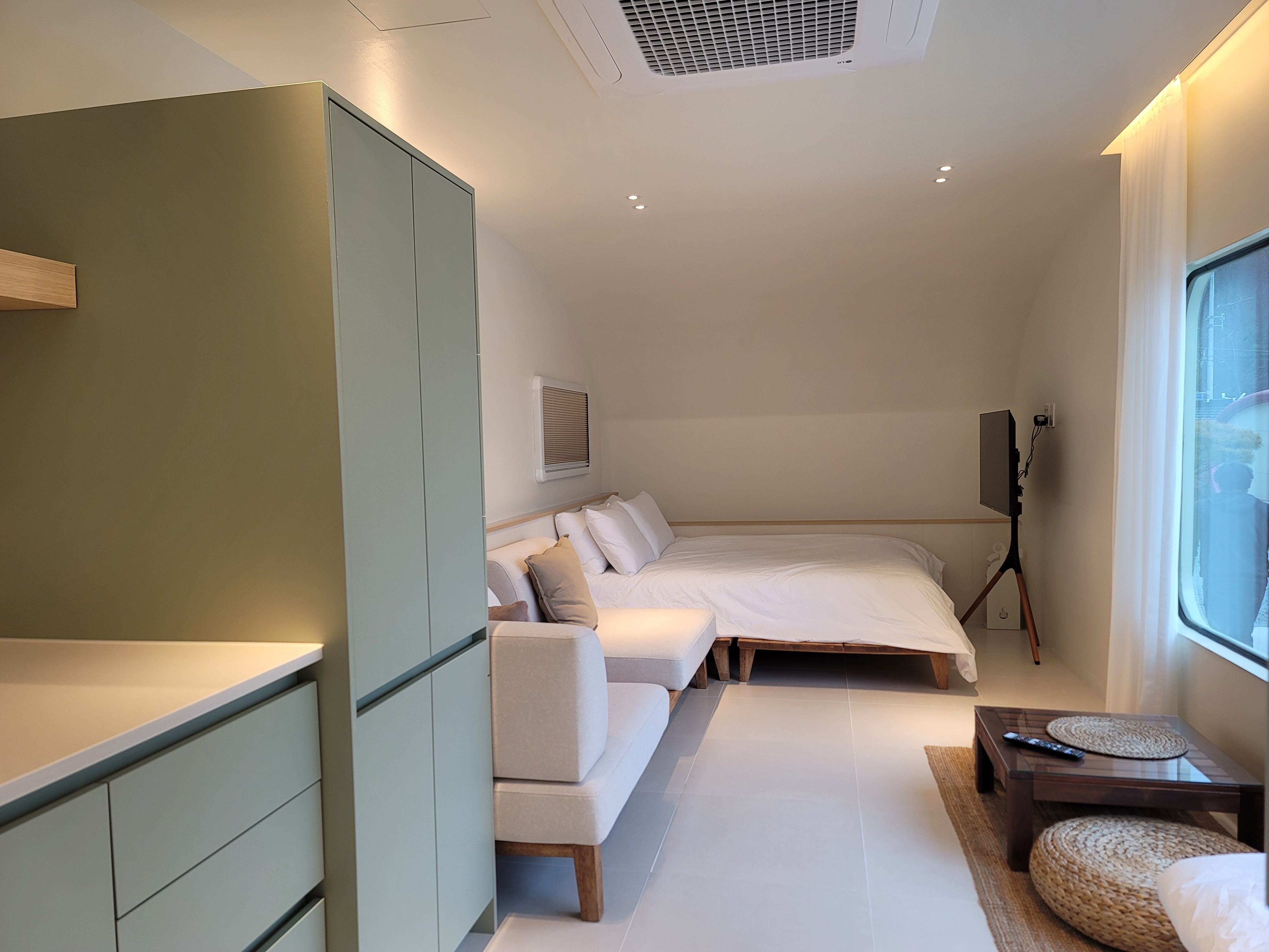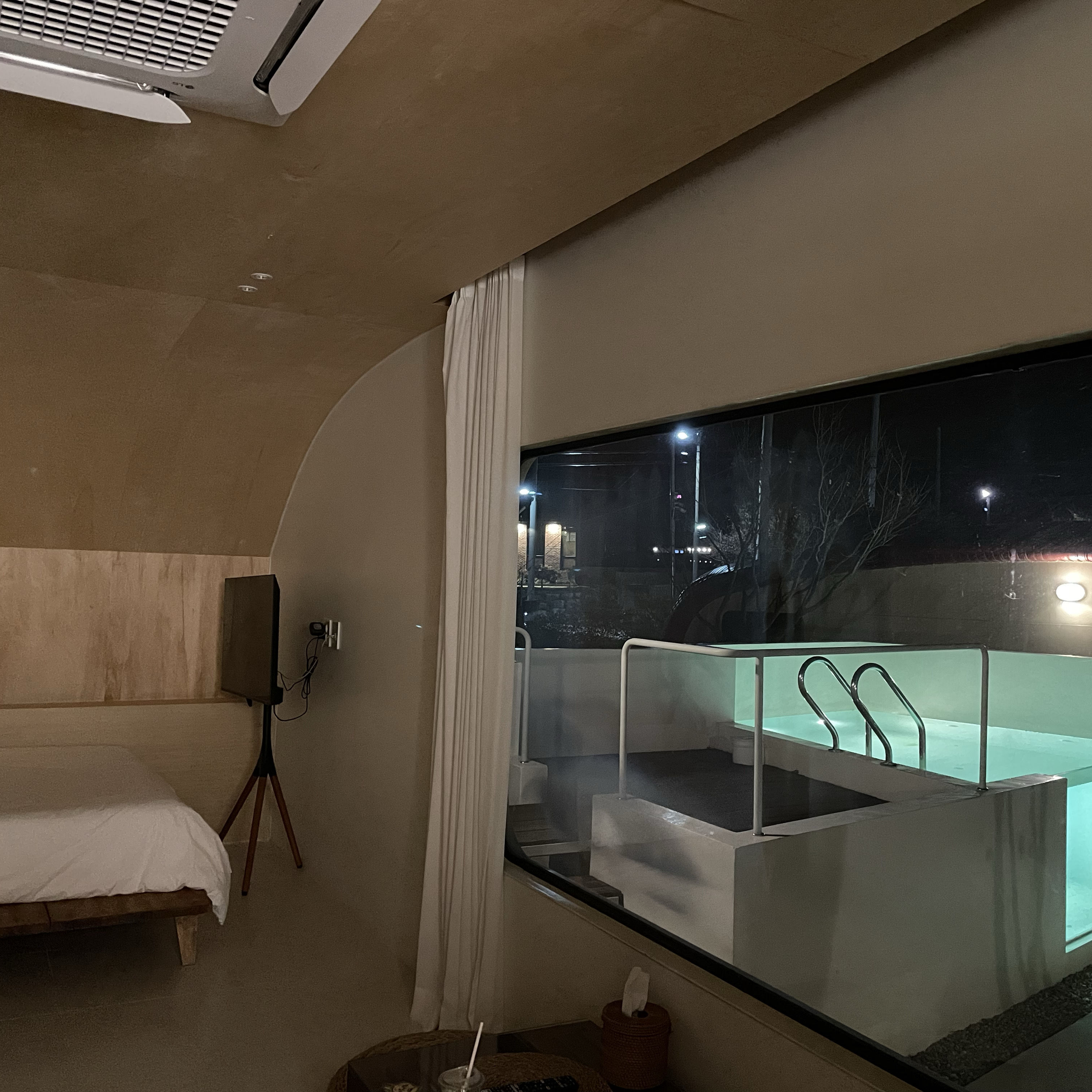 위치상 한옥마을메인거리 가기도 가깝고, 실내 인테리어가 굉장히 모던하면서 고급진 분위기였어요. 작은 공간 아니고 편안하게 묵을수 있는 적당한 사이즈였고, 조명시설이 잘되어있어 사진도 이쁘게 찍히고 셀카찍고 놀만 했어요. 카라반 몇 번 묵었는데, 이렇게 깨끗하고 따뜻한 곳은 오랜만인거 같아요. 날이 급 추워졌는데, 추우면 어쩌나 걱정했는데 춥지않게 잘 쉬다 왔습니다. 바깥에 풀빌라처럼 개인 수영장도 있던데, 날시 따뜻해지면 수영장이랑 같이 이용해야겠어요.