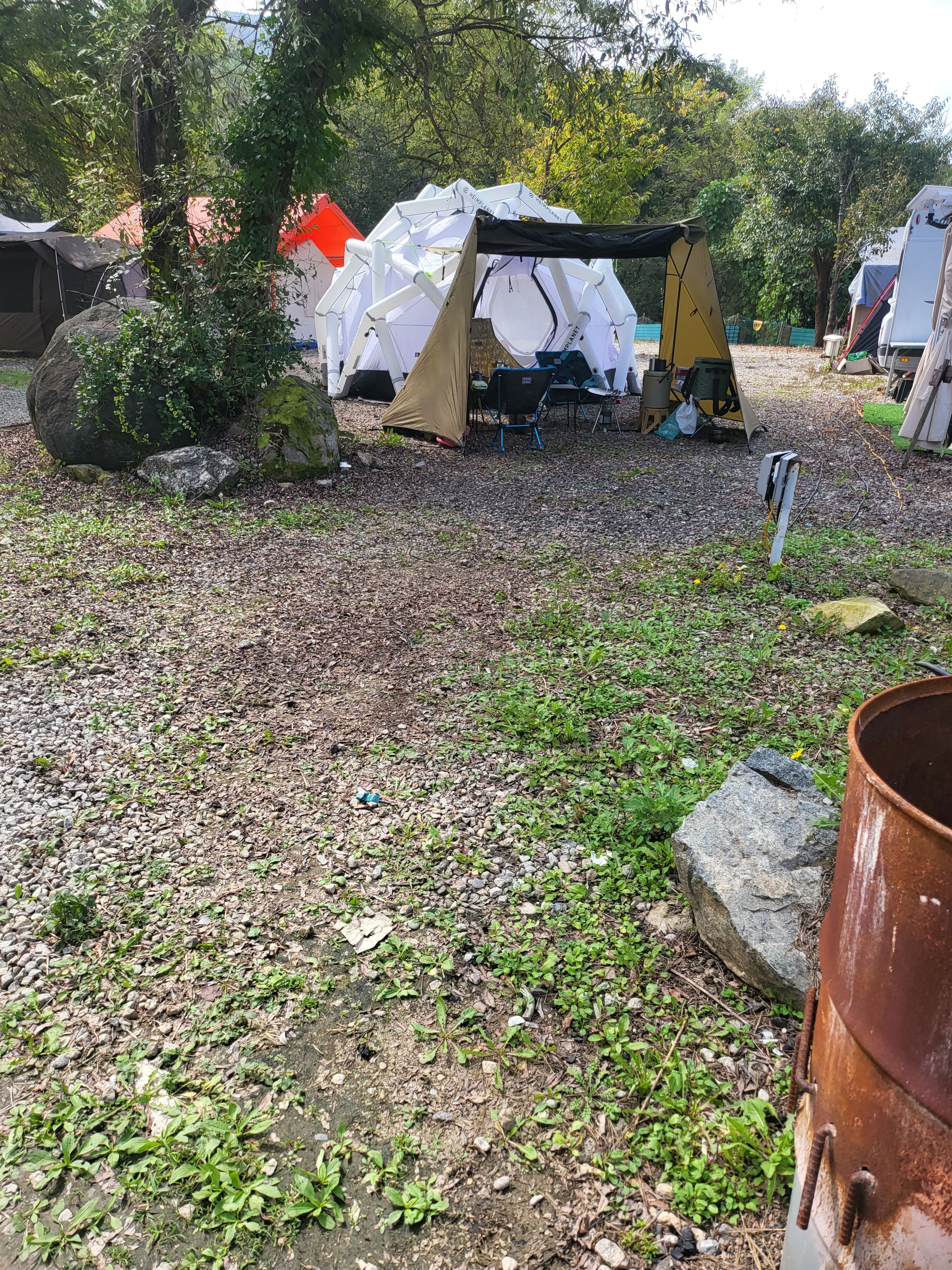 마운틴뷰라 경치좋고 사이트 크기는 전체적으로 렉타타프1개 설치가능공간 엑스폴대사용해서 돔텐트 안으로 넣고 1박 캠하고 왔구요 선착순 사이트라 아침일찍 8시부터 피칭할수 있어 하루가 길어 좋아요~ 단 매너타임 관리가 안되는것 같아요~