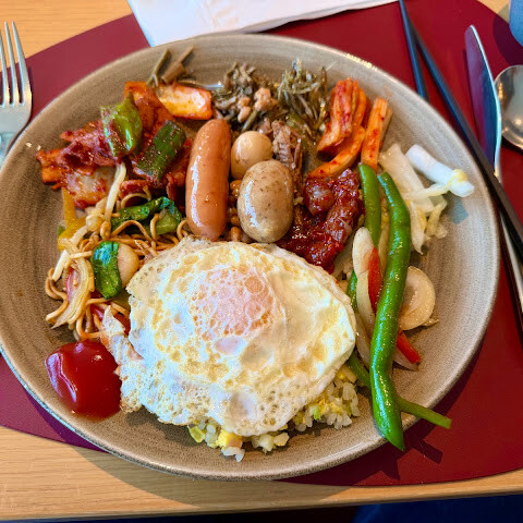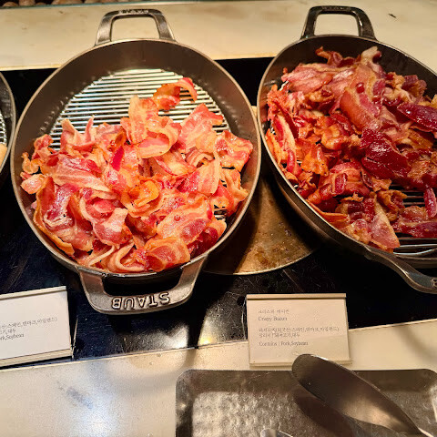 심지어 하루에 한 사람당 세 벌의 옷을 건조하거나 다림질해 주는 서비스까지 제공해 주더군요! 뷔페는 최고 수준이었고, 미국, 한국, 유럽, 그리고 다른 아시아 요리까지 다양하게 준비되어 있었습니다. 베이컨도 바삭한 것과 일반 것 두 가지로 구워져 나오는 등 세심한 배려가 정말 인상적이었습니다.