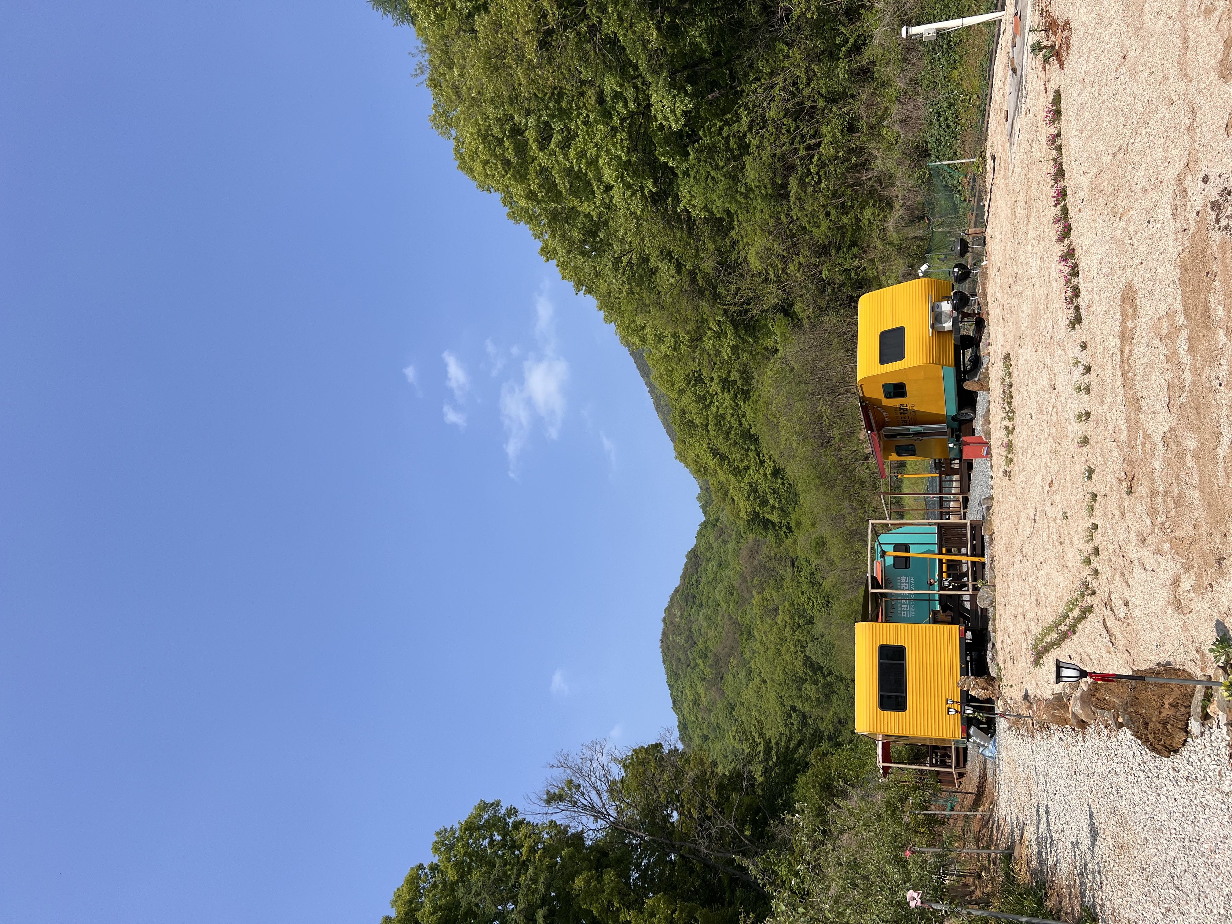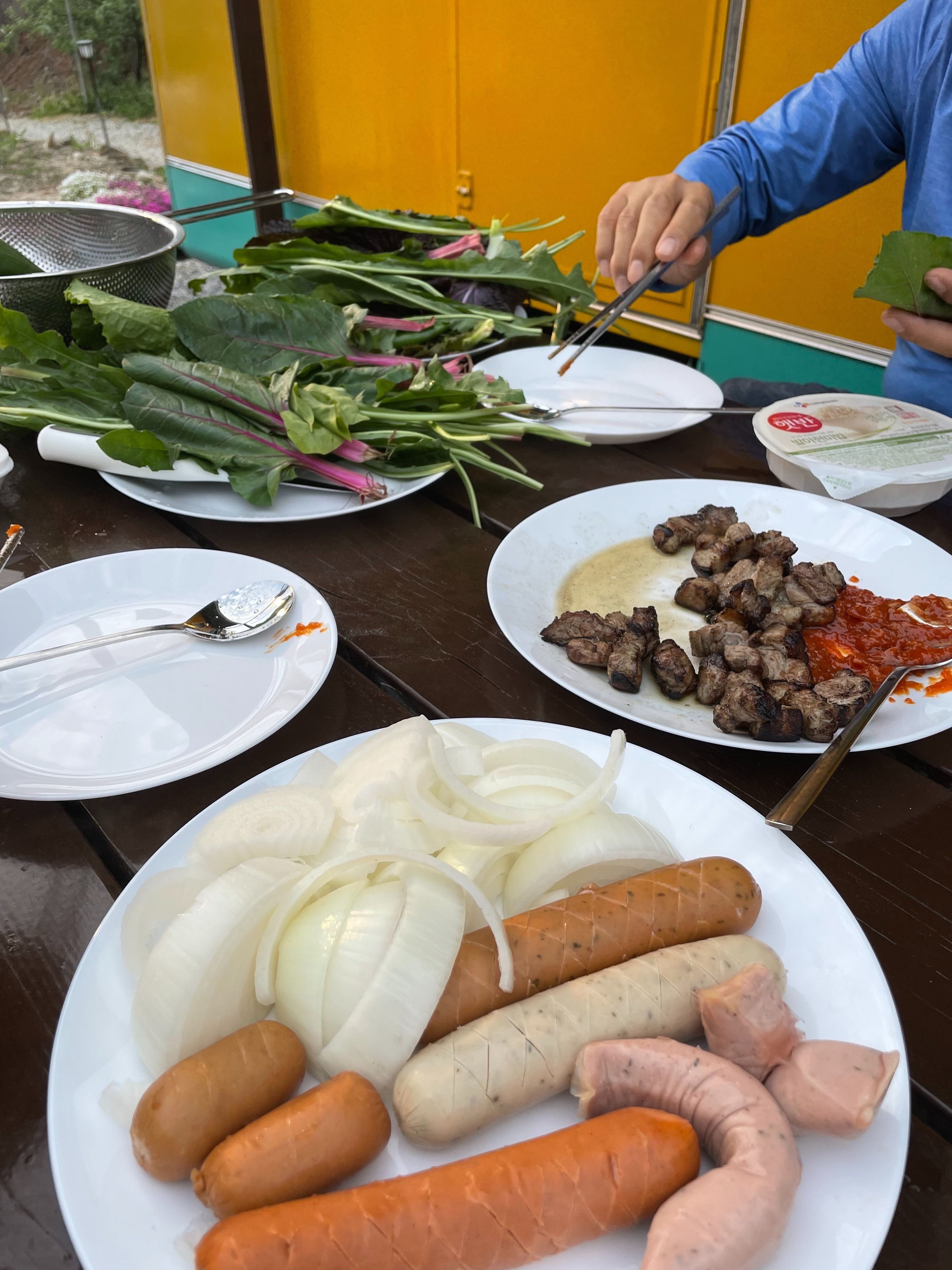 들어가면 주차하고 작은 밭을 지나 안으로 들어오면 카라반 3대가 있습니다 너무 크지 않아서 조용히 지낼 수 있는게 가장 큰 장점 같습니다. 각 카라반 옆에 데크도 있고 바베큐도 뚜껑있는거여서 고기도 훈제로 해먹기도 좋았습니다.