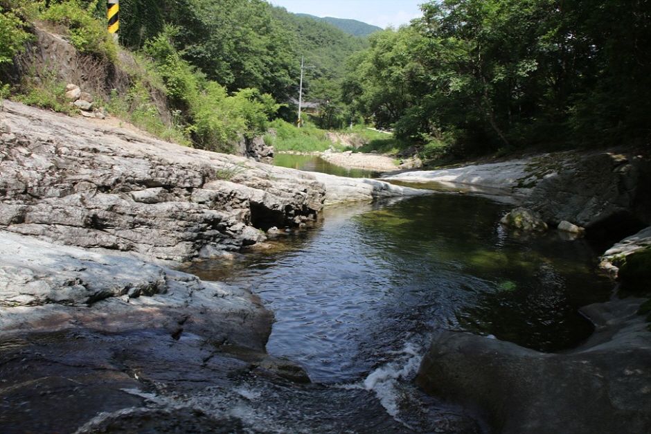 용담사 앞에 위치한 계곡. 물이 매우 깨끗하고 물살이 거세지 않아 어린 자녀들을 데리고 가기에도 젛은 곳