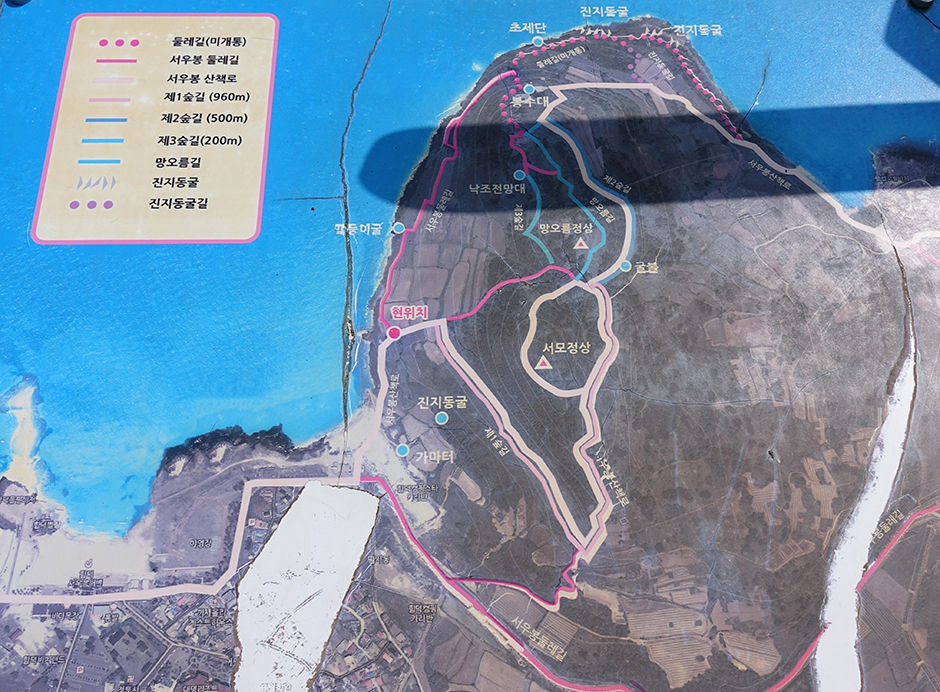 서우봉둘레길은 제주도 조천읍 함덕해수욕장 동쪽 바다에 접해 있는, 제주 올레길 19코스에 포함된 길이다. 봄이면 노란 유채꽃이 에메랄드빛 함덕 해변과 어우러져 최고의 산책 코스로 손꼽힌다. 서우봉은 완만한 등성이가 크게 두 봉우리를 이루고 있는 원추형 화산체이며 바라보는 조망이 좋아 새해마다 일출제가 열린다. 서우봉은 역사적으로도 의미가 있는 곳이다. 진도에서 거제로 피신해온 삼별초군이 마지막으로 저항하였던 곳으로 김방경 장군과 삼별초군의 전투가 벌어진 지역이다. 서우봉 정상은 조선시대에 만들어진 봉수대가 있었고 일제강점기에 일본군이 구축한 동굴이 20곳 있다. 정상에 올라 함덕의 아름다운 물빛과 멀리 보이는 한라산을 감상하며 여유를 만끽하기 좋고, 패러글라이딩을 즐기는 인구가 늘고 있다.