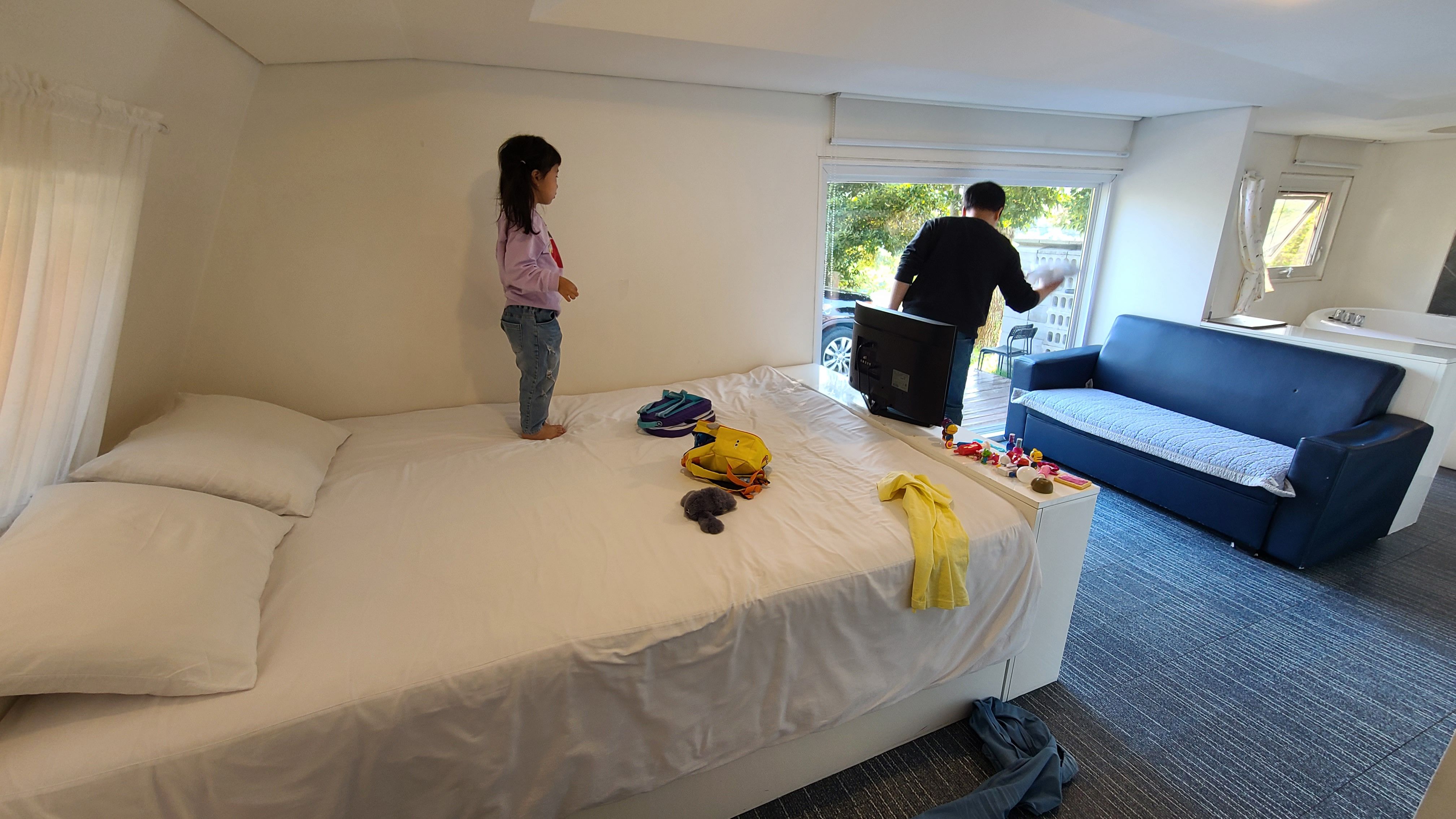 바다가 좀 멀지만 그래도 창으로 바다가 보이구요 진짜 조용하고 스파도 좋았어요 완전 최신식은 아니라도 사장님께서 엄청 관리를 잘하시는것 같았어요 엄청 친절도 하셨구요 침대도 생각보다 꽤 넓었구요 전반적으로 즐겁게 잘 다녀왔어요