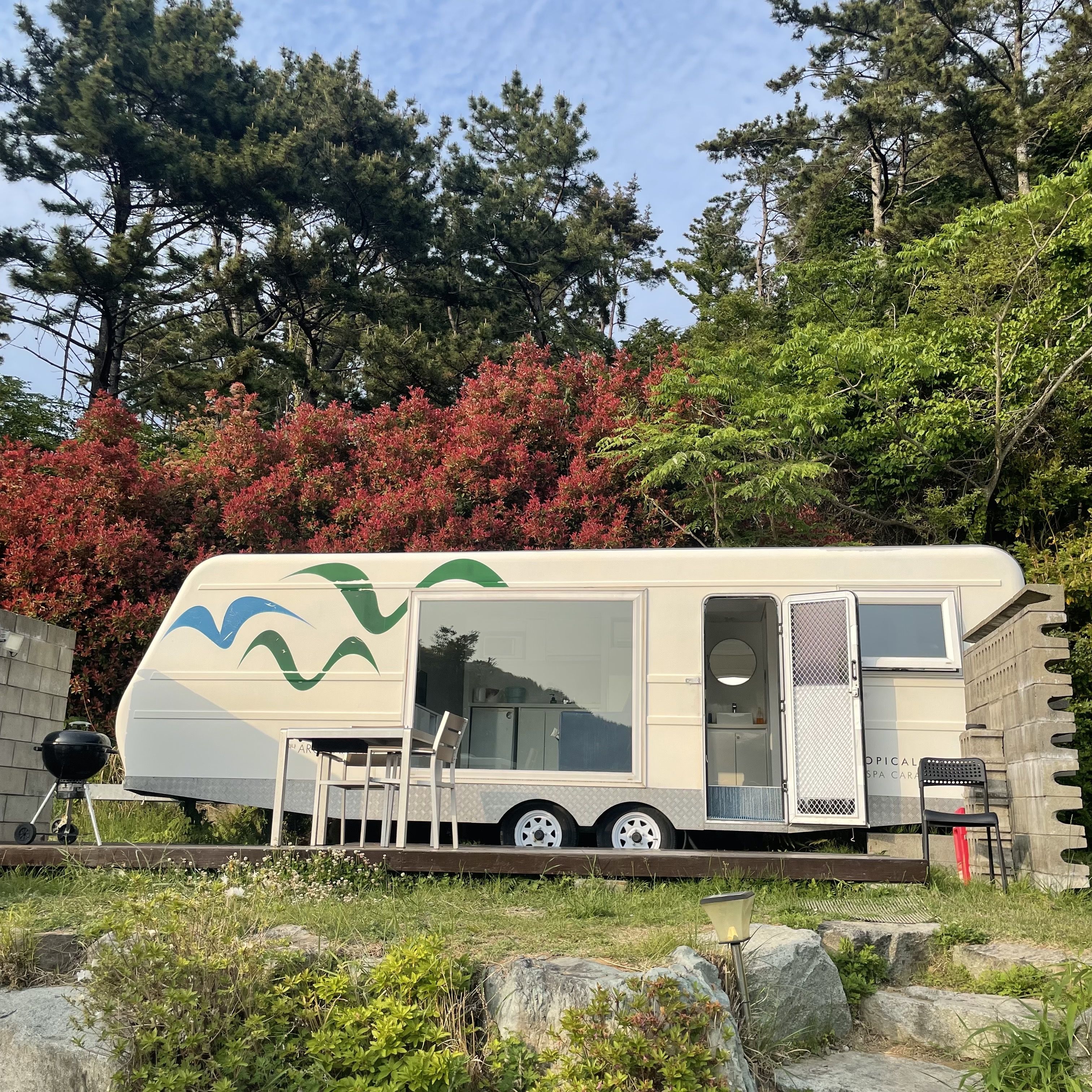 카라반 느낌도 너무 이뻐서 캠핑 느낌도 났구요. 개별바베큐, 오션뷰, 슾속뷰, 스파 등이 다 가능해서 대만족이었어요!!