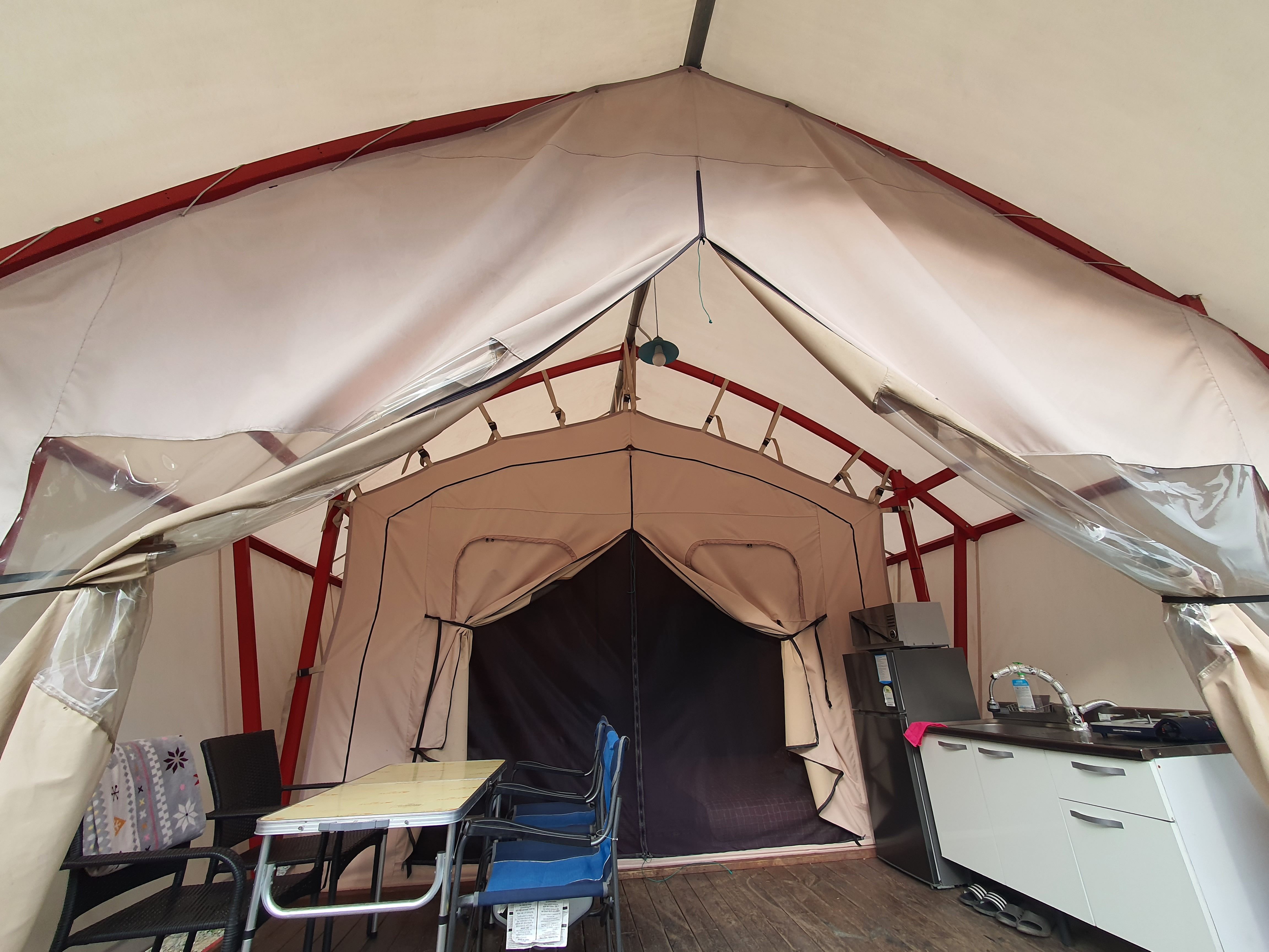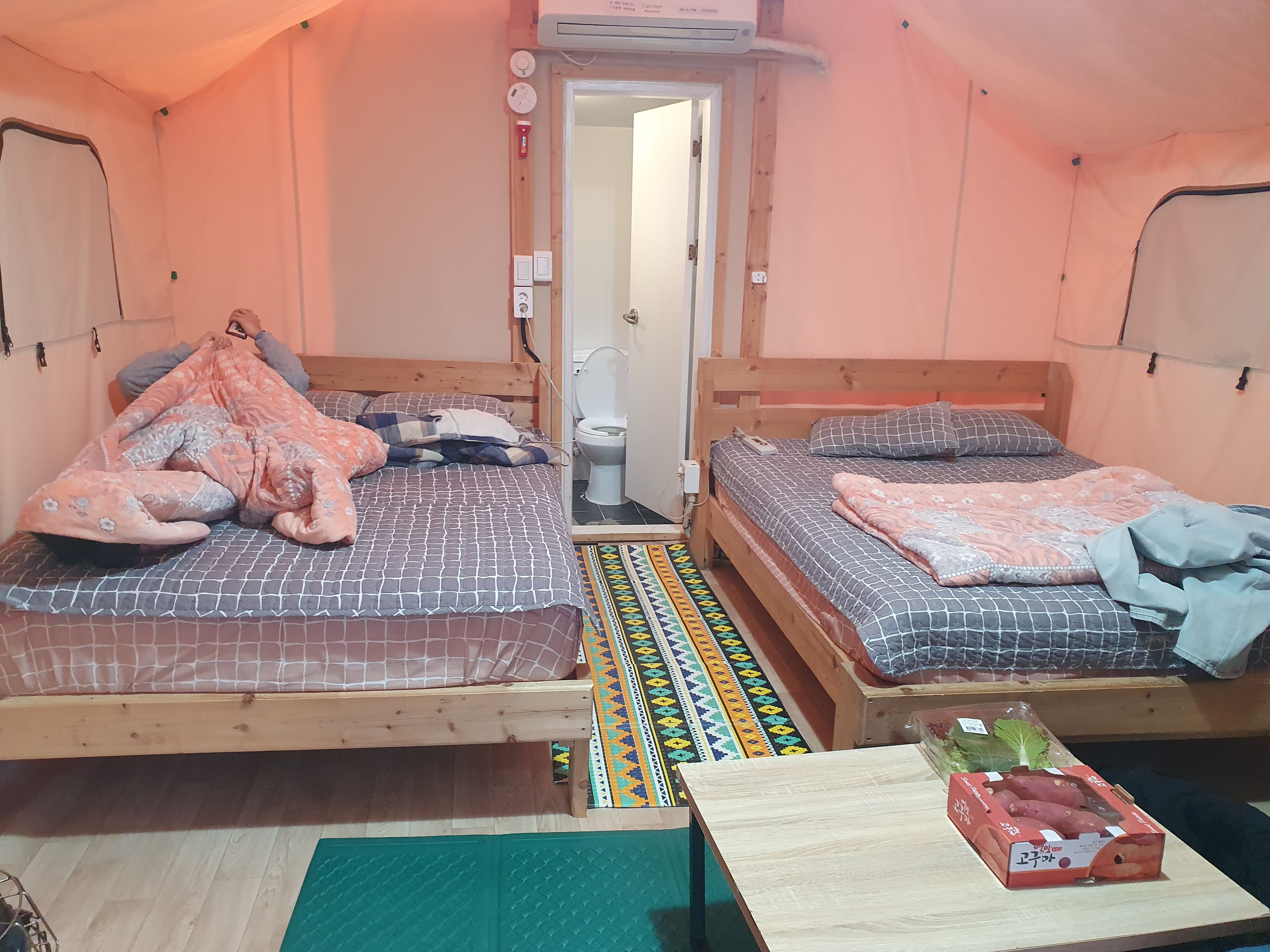 하필 이번 겨울 가장 추울때라 싱크대에서 물안나오고 바람이 부는데 텐트 전체가 흔들려서 밤새 잠을 설쳤어요 거기다 침대 상태도 안좋고 바닥은 삐그덕 거리고 안에 화장실 있고 침대도 2개 있는게 장점이긴한데 겨울에는 다시 생각해보세요