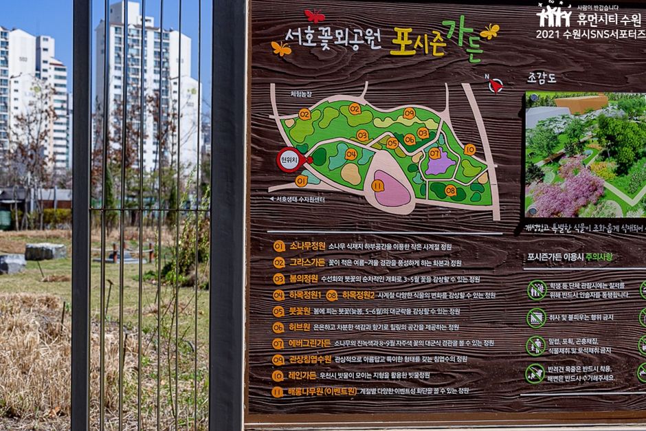 11개 영역으로 되어 있는 포시즌 가든이 있다. 또한 공원 둘레를 산책할 수 있는 산책로도 마련되어 있다. 잔디광장과 운동할 수 있는 시설이 있어 주민들에게 사랑받는 힐링장소다.