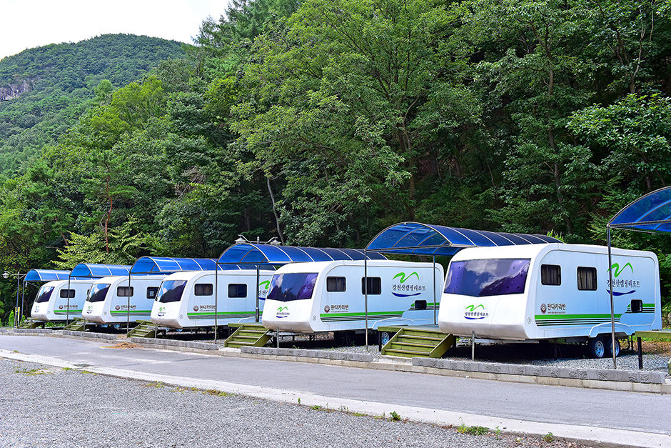 강천산캠핑 (뜨란채)는 강천산 캠핑리조트 내에 위치한 캠핑장으로 캐러밴, 펜션, 식당을 함께 운영하고 있다. 펜션은 10개 객실, 캐러밴은 7대가 마련되어 있고, 4명에서 최대 6명까지 가족단위로 이용할 수 있다. 캐러밴은 5평의 면적임에도 일상생활에 불편함이 없을 정도의 캠핑시설을 다 갖추고 있다. 침실은 메인 침실과 2층짜리 간이 침실이 있으며, 신발장과 필수 주방도구 등이 구비되어 있다. 또한 굴비한정식, 생선구이 등을 판매하는 식당에서 식사를 해결할 수도 있다. 식당의 조식 서비스를 이용할 수도 있는데 하루 전에 예약을 하면 1인 8,000원 가격에 ‘가정식밥상‘을 제공한다. 조식시간은 오전 9시~10시다. 식당 이용객들에겐 커피 할인권을 제공하고 있어, 공기 좋은 카페테라스에서 커피 한 잔의 여유를 즐길 수 있다.