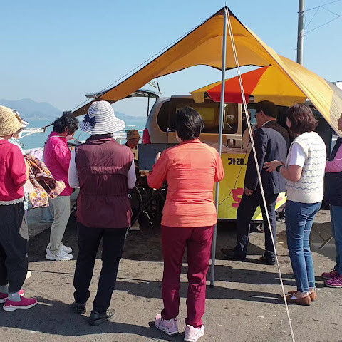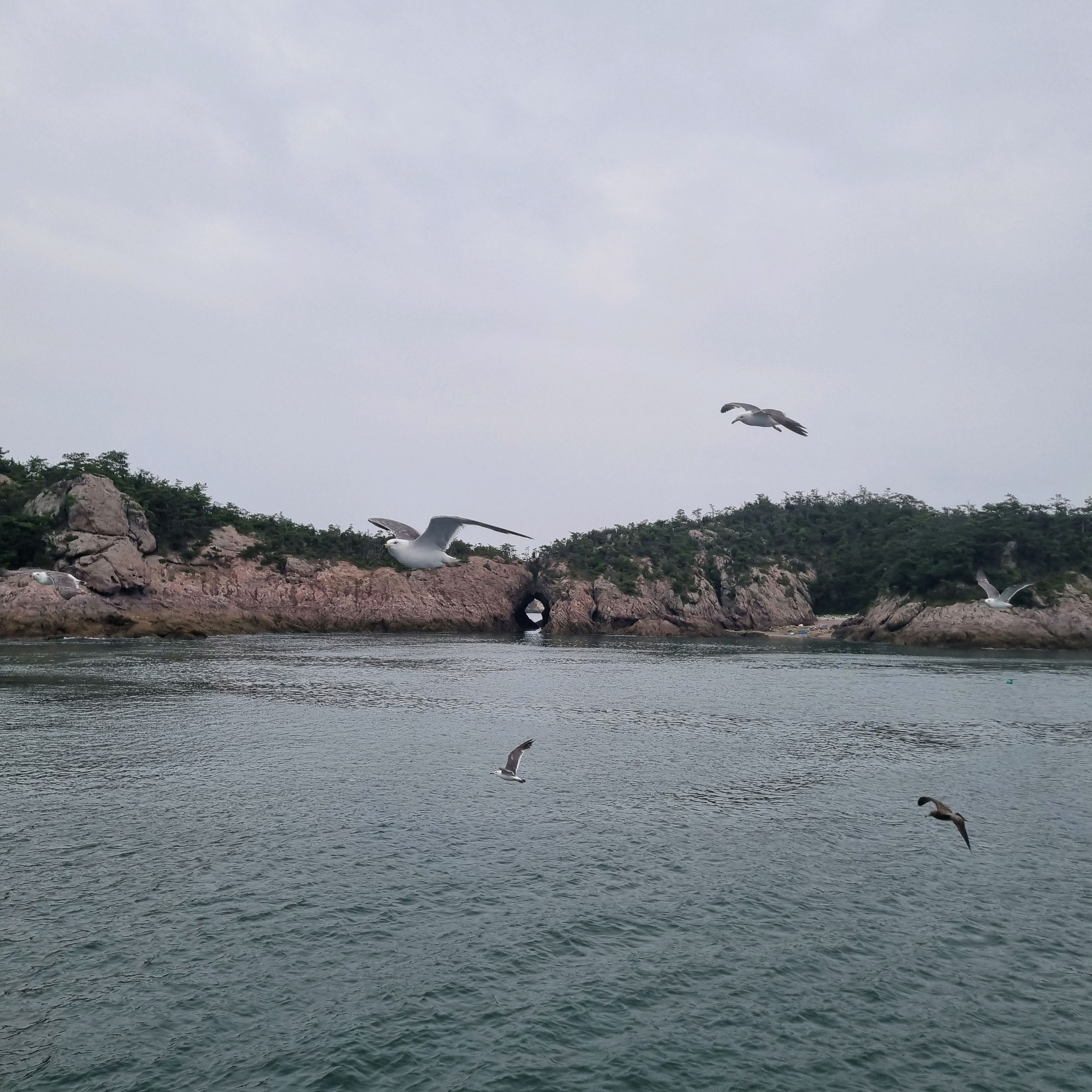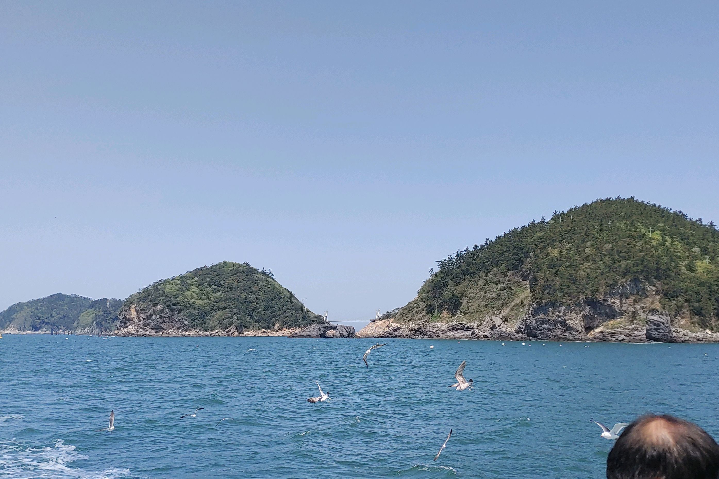 남편 바로 👌 단체버스가 두대. 우리처럼 부부나 가족단위로 많은 사람들로 북적~1층 선실 들어서니 와 에어컨은 빵빵한데 음주가무 ㅎ노래방있어서 노래하는 분들이 많고 사실 시끄러워서 바로2층으로~이층 선실은 작은편이라 이미 자리는 다 채워져서 갑판으로~여기 저기 갈매기들 새우깡 주느라 어른 아이들 모두 행복해하고~ 선장님 오른쪽 외쪽 번갈아 가며 설명해주시는데 사실 들어오진 않고 풍경과 바다와 갈매기들 예뻐서 동영상 ,사진 찍느라 ~좋다좋다