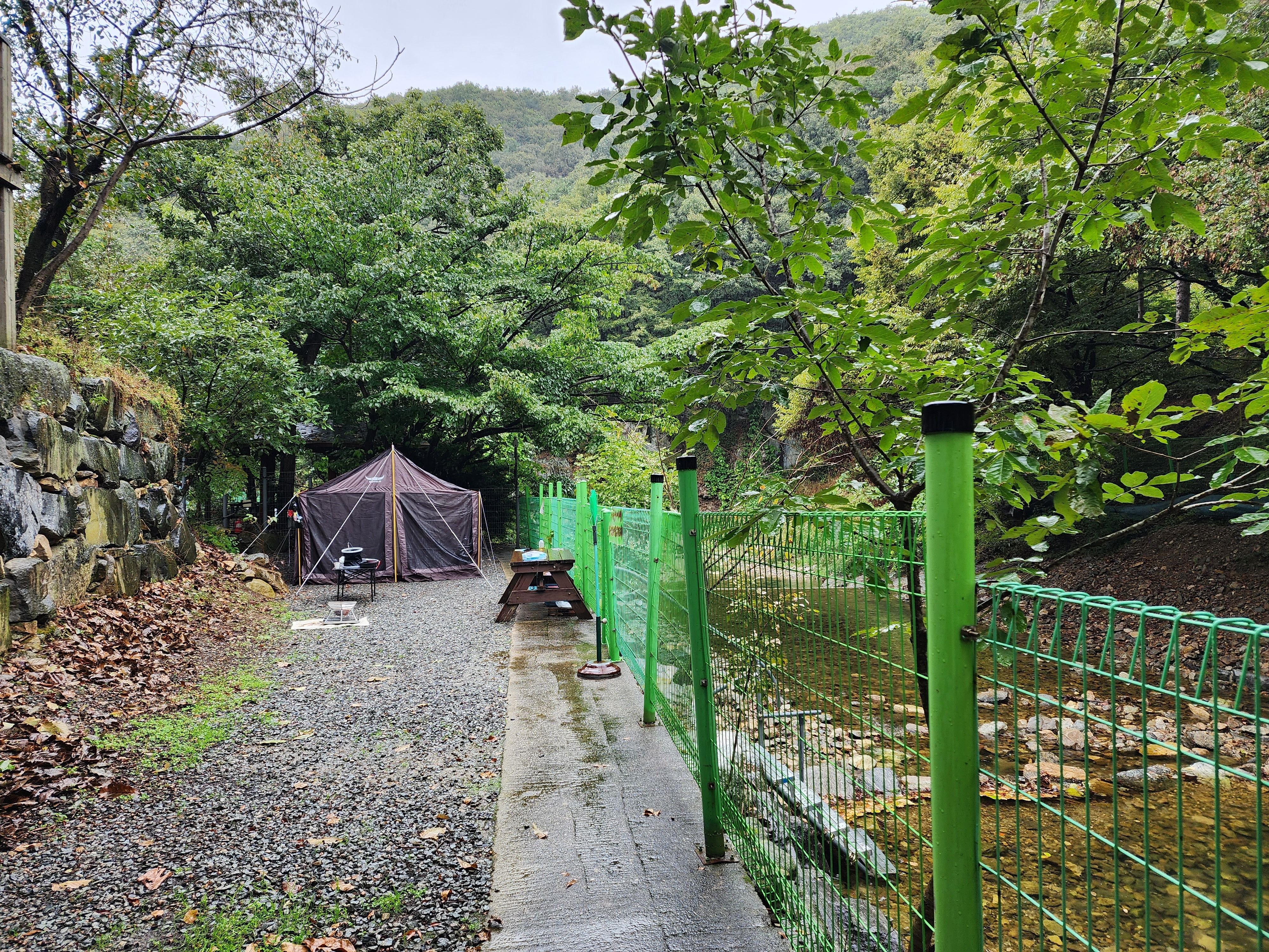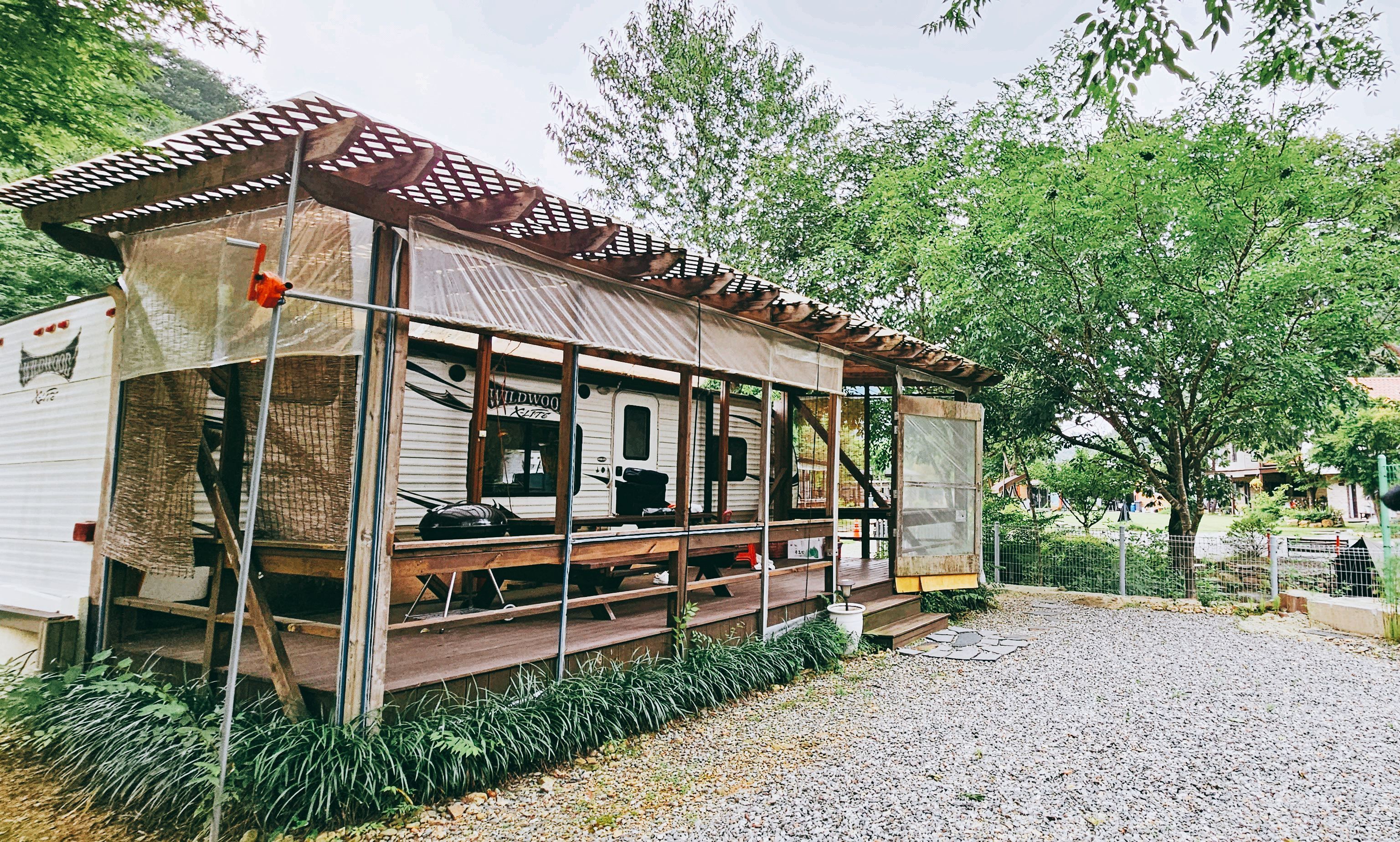 계곡이 바로 앞에 있고, 저희가 갔을 때 저녁부터 다음날 아침까지 비가 많이 왔지만 계곡과 높이차이가 꽤 있어서 문제 없었습니다. 빗소리에 힐링하고.. 카라반 앞 데크에 지붕이 있어서 비멍하며 바베큐 해먹는 운치가..!!