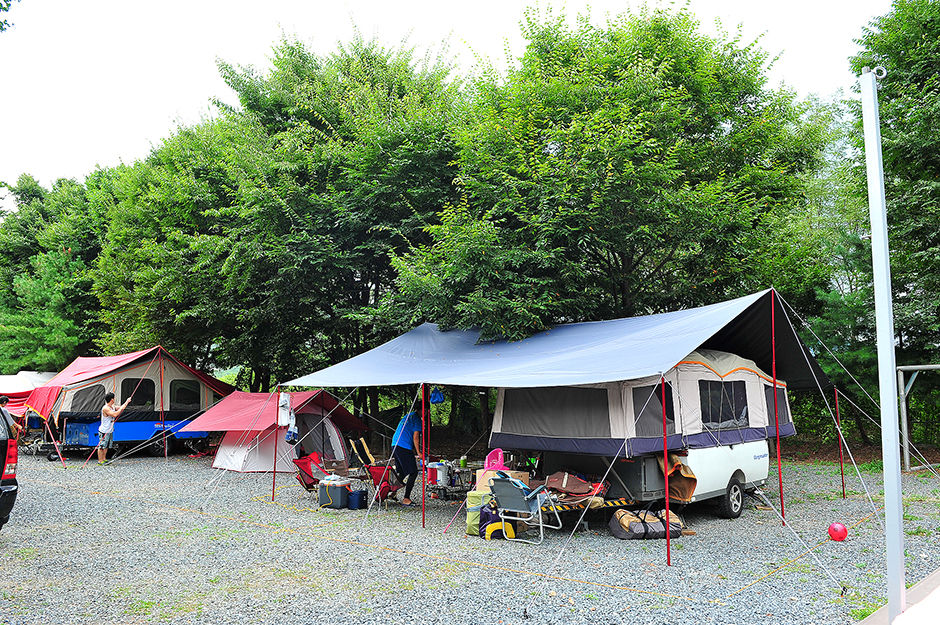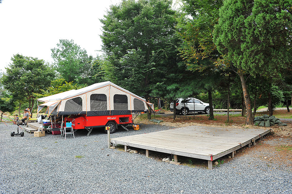 캠핑은 모든 사이트가 지정석이 아닌 선착순으로 오는 순서대로 맘에 드는 사이트를 이용하면 된다. 사이트는 데크와 파쇄석이 있으며, 데크 옆 파쇄석에 개인 트레일러나 카라반 주차도 가능하다. 사이트마다 소화기가 설치되어 있으며, 캠핑 사이트에 이동 동선에 따라 조명등이 설치되어 있다. |
