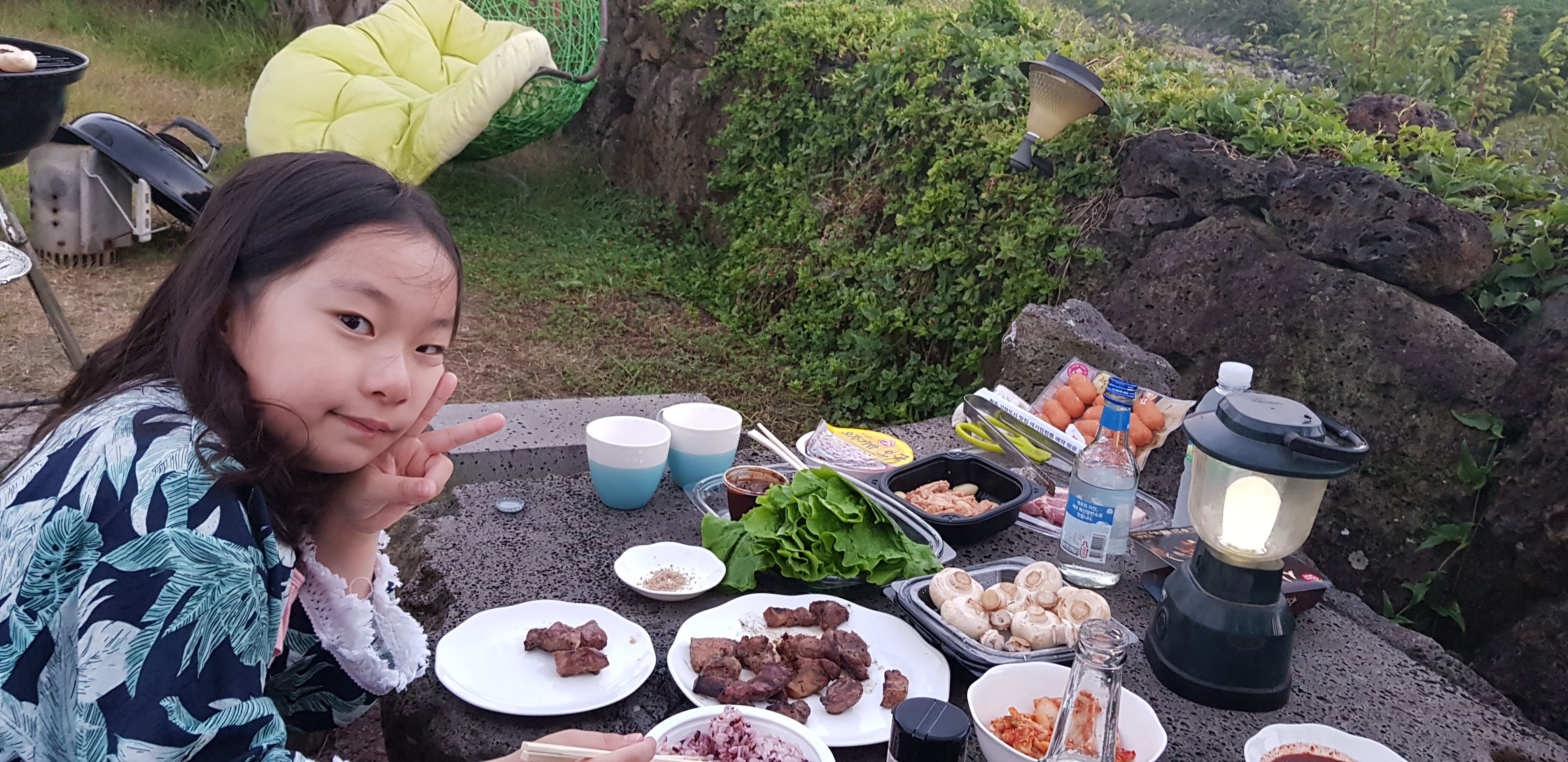 카라반앞 현무암 테이블에서 바베큐도 운치있구