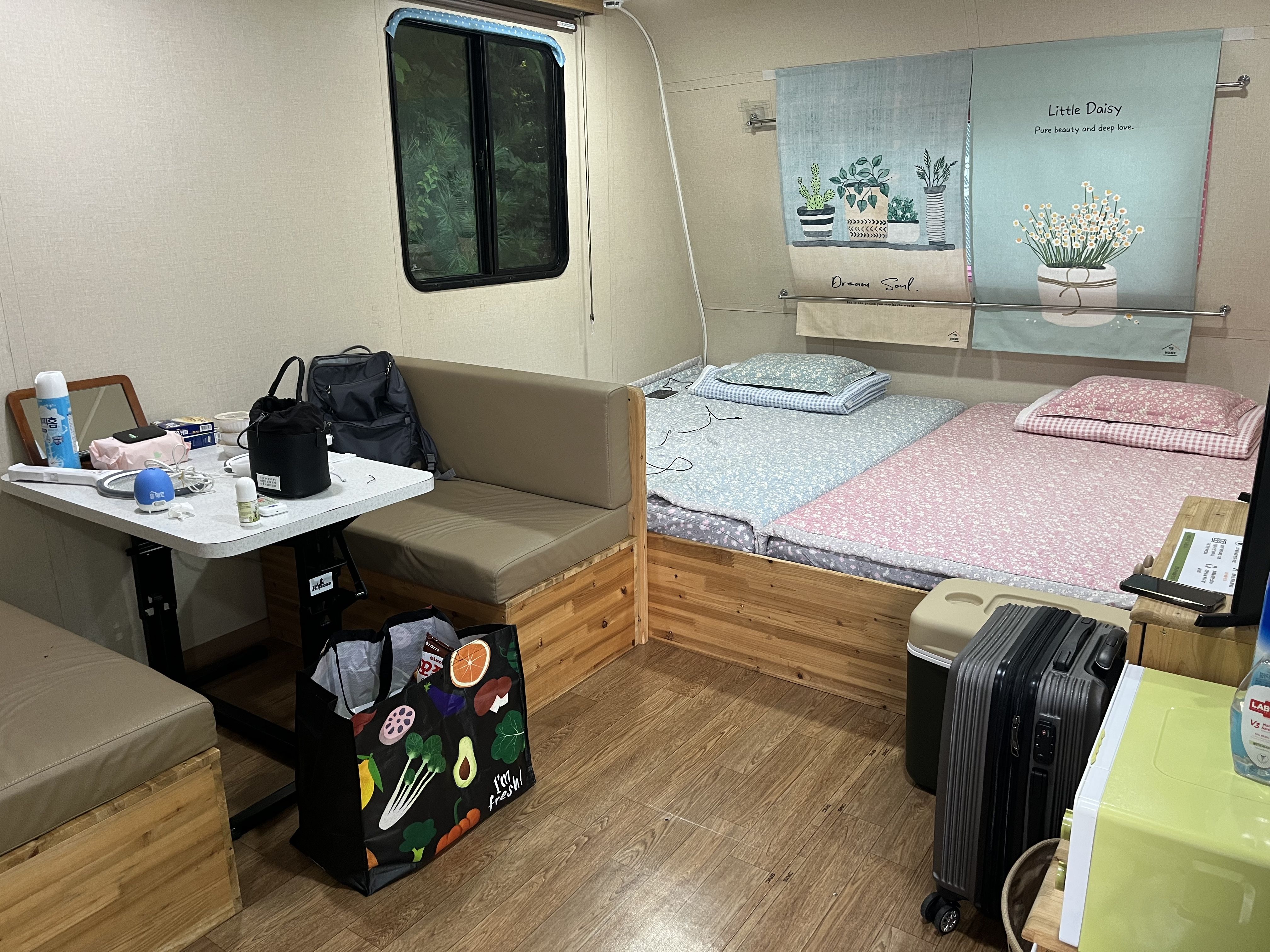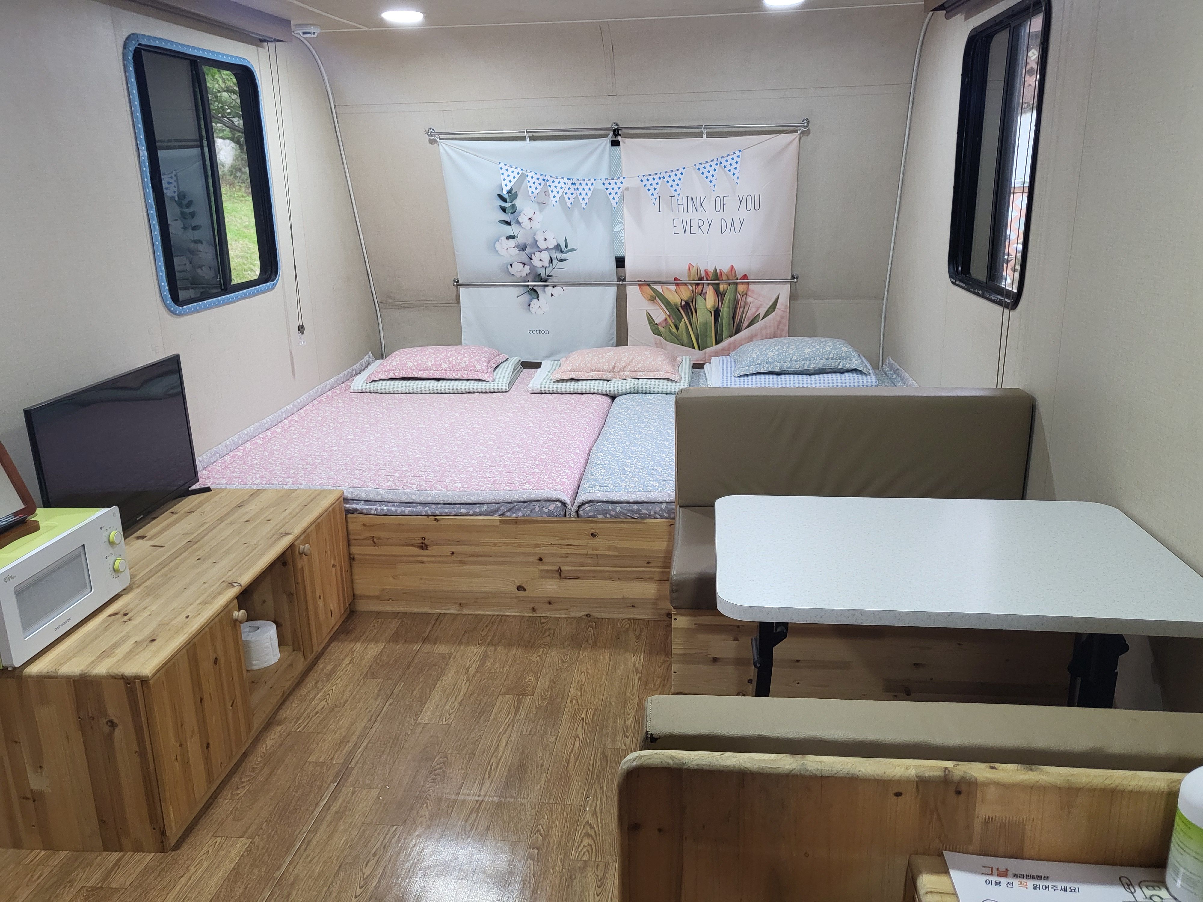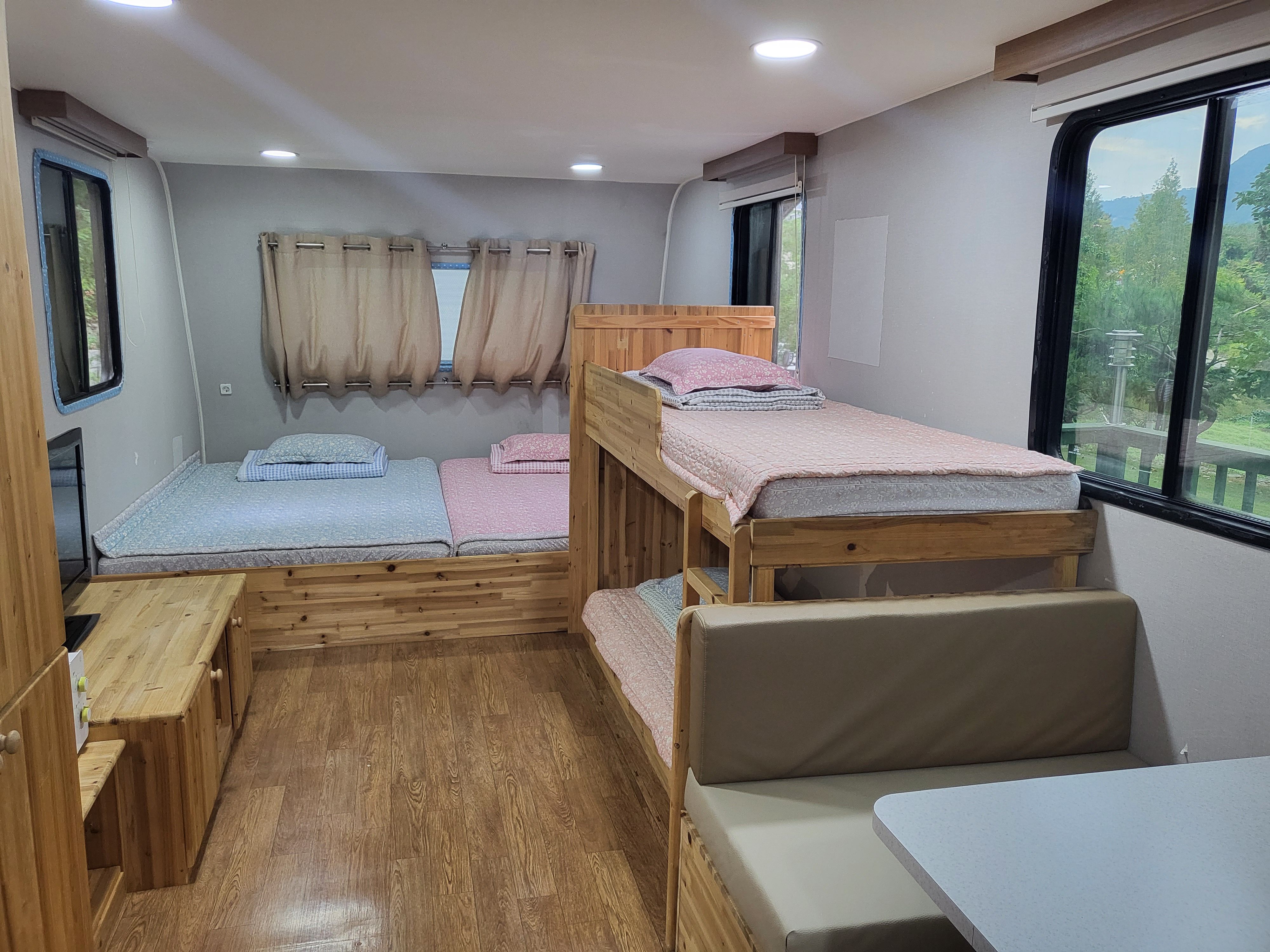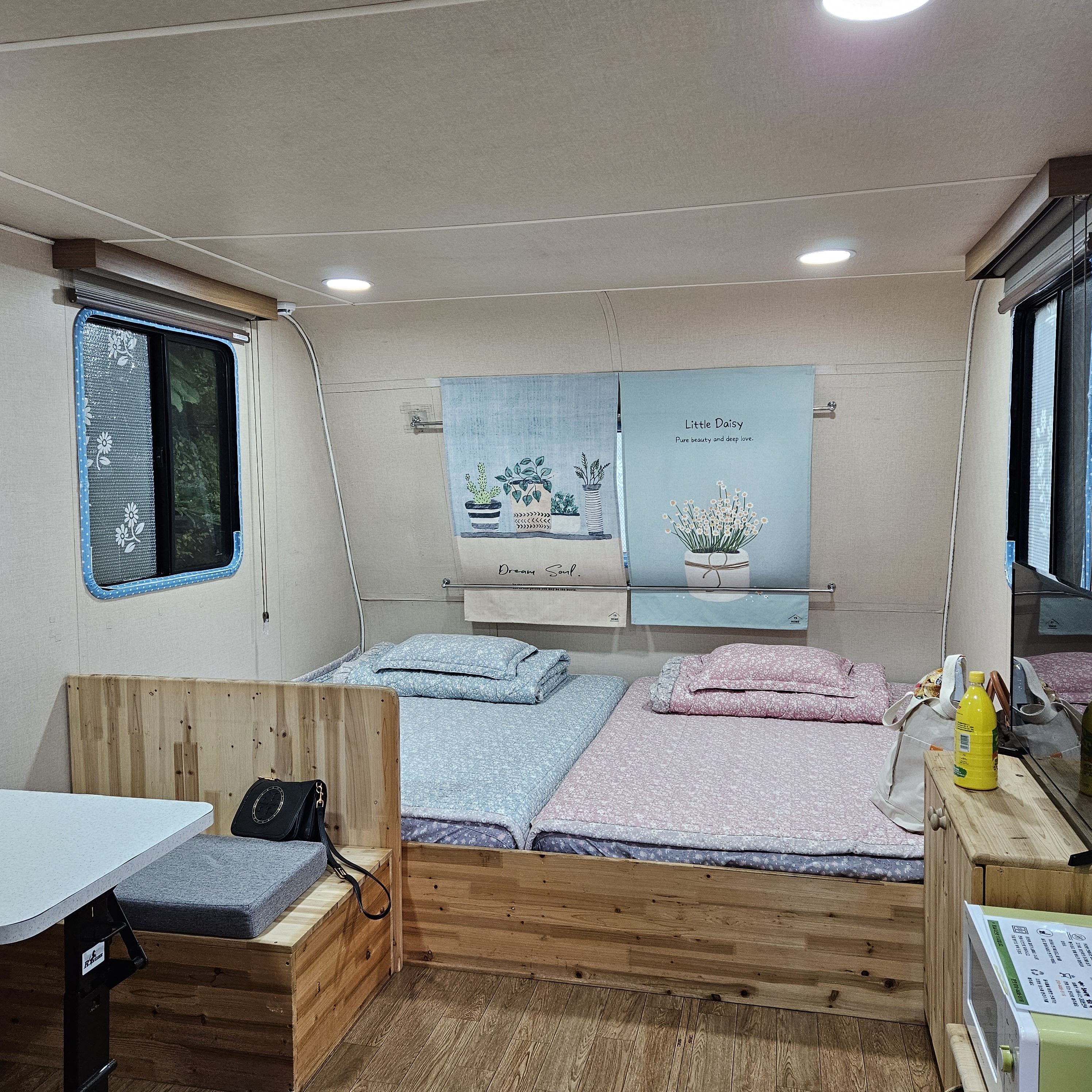 카라반인데도 내부가 넓어서 좋았어요:) 침대도 4개에 그중 매트리스 두개는 넓어서 좋았답니다! 만족스러운 숙소였어용