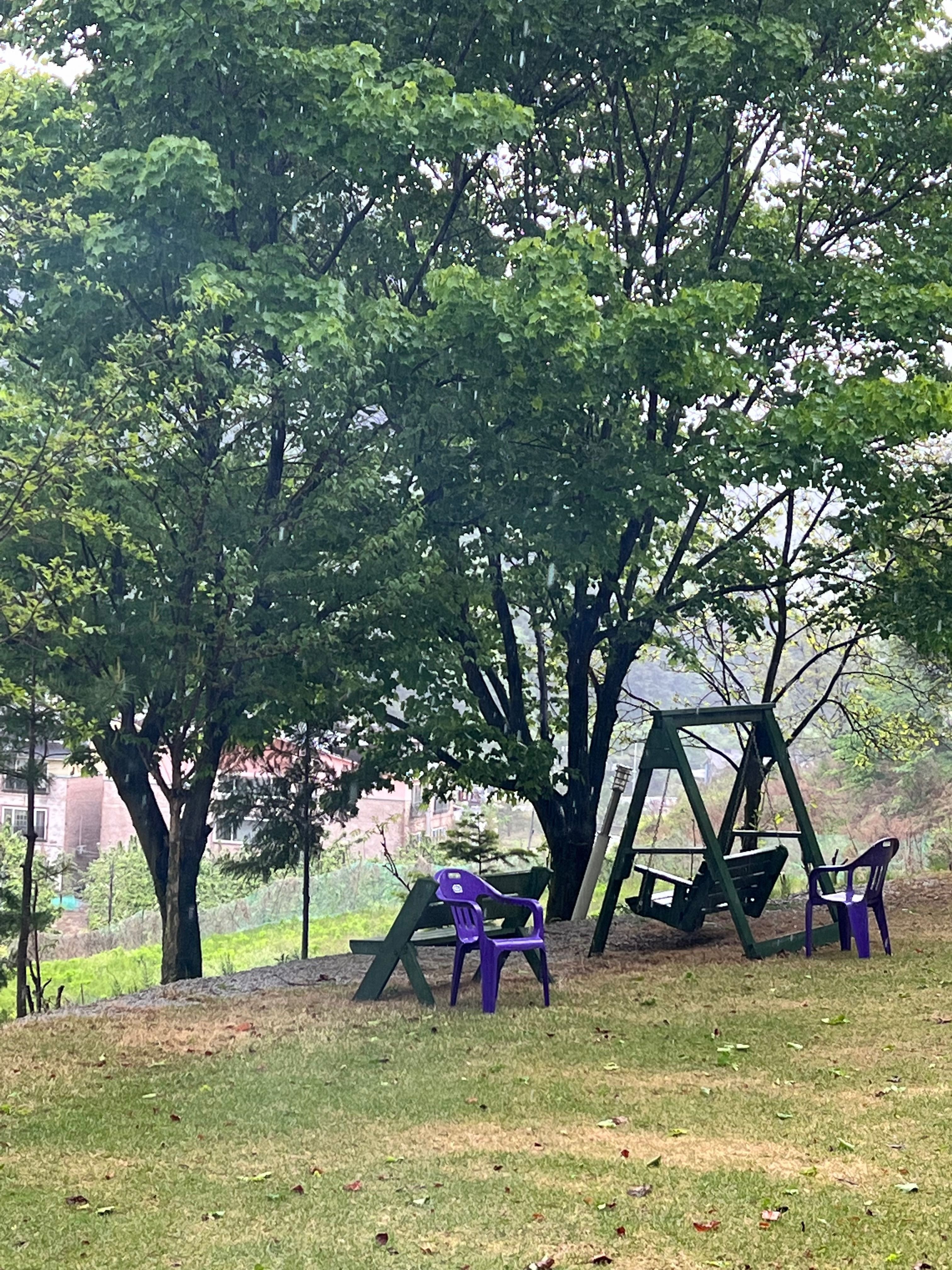 산윗부분에 위치하여 조용하고 해먹이랑 그네가 있어 타보기도하고 밤이되면 반짝반짝 전구가 들어와서 운치있어요